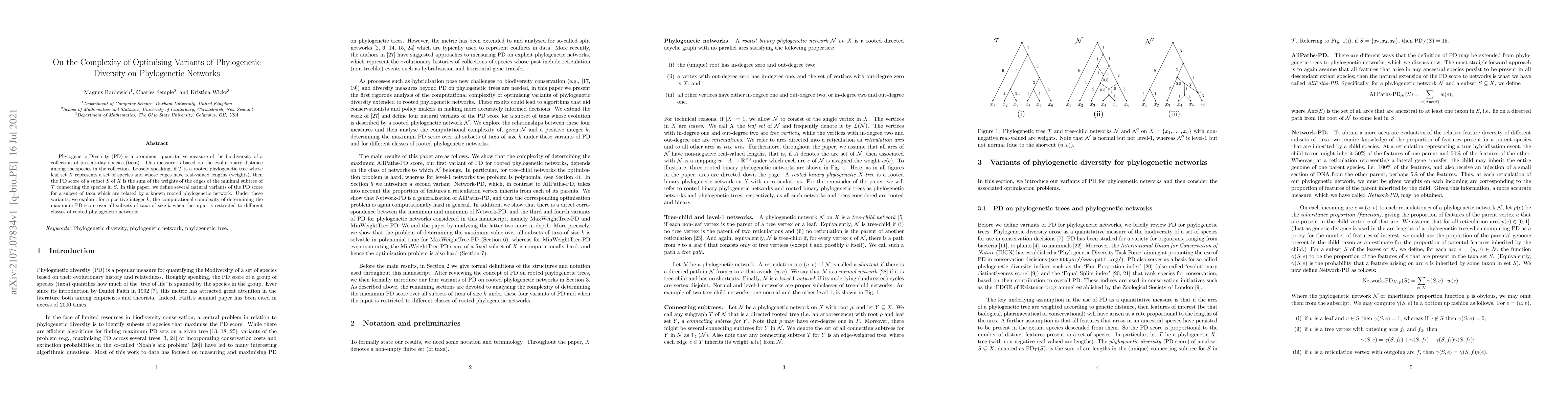 This paper investigates the computational complexity of optimizing various measures of phylogenetic diversity (PD) on phylogenetic networks, focusing on determining the maximum PD score for subsets of a fixed size within different network classes. The study highlights the challenges and complexities involved in these optimization problems.