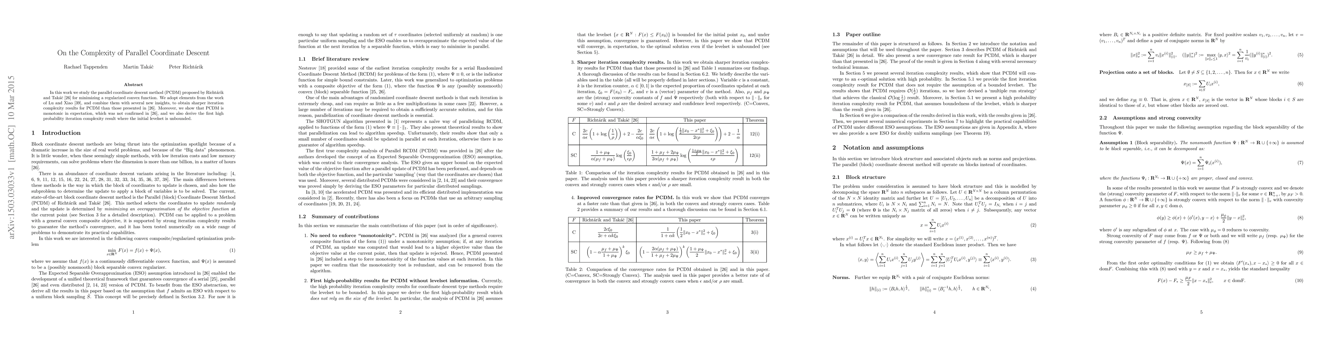 Researchers studied parallel coordinate descent (PCDM) for minimizing convex functions and found sharper iteration complexity results than previous work. They also demonstrated that PCDM is monotonic in expectation and derived a high-probability iteration complexity result.