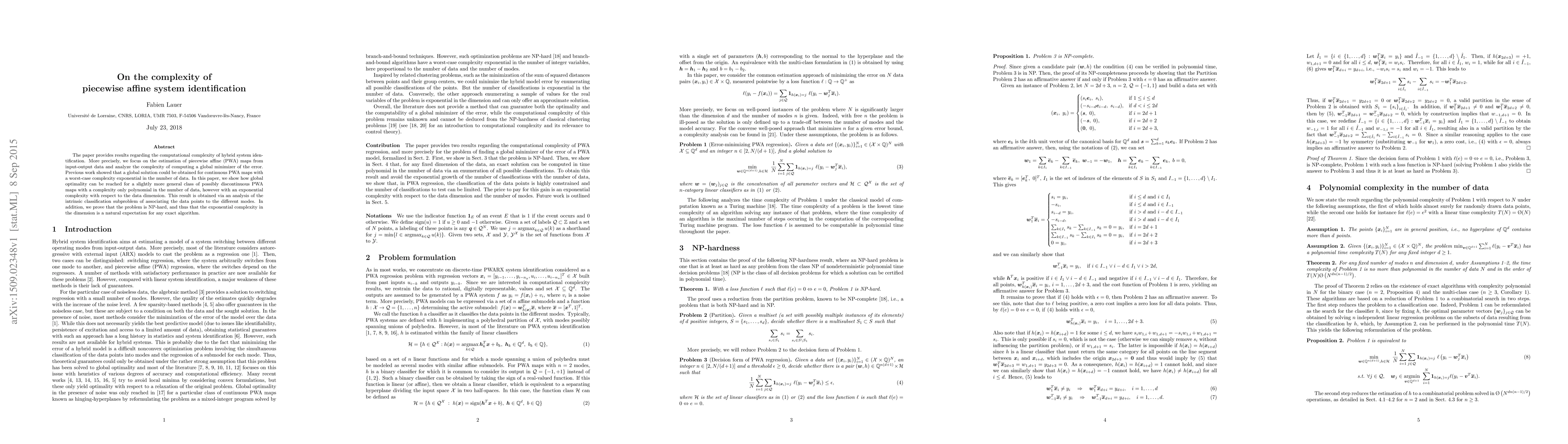Researchers found that piecewise affine system identification can be solved with a polynomial complexity in data points but an exponential complexity with respect to the dimension, showing it's NP-hard.