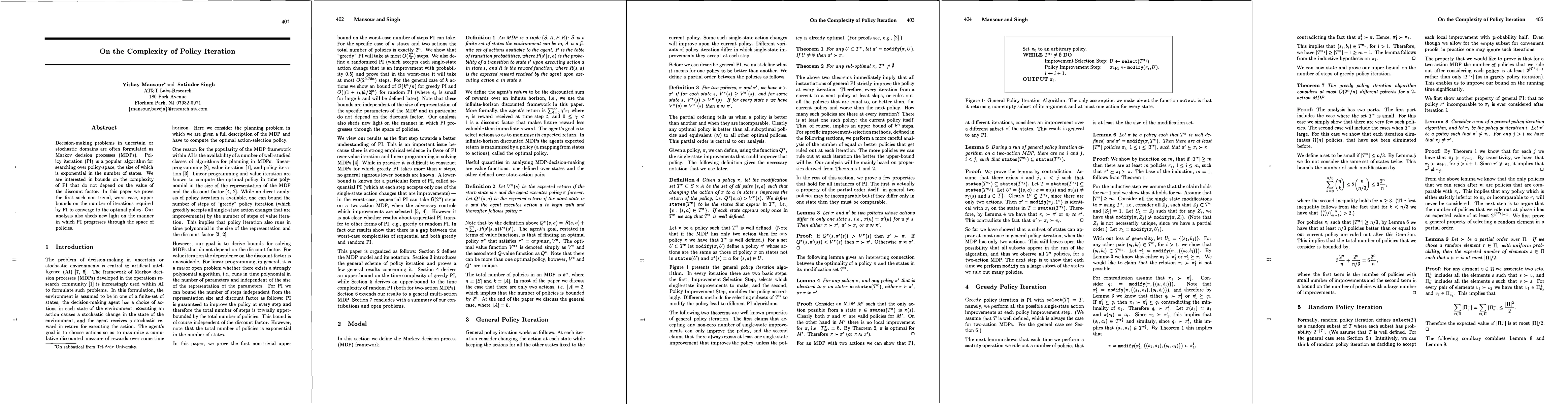 Decision-making problems in uncertain or stochastic domains are often formulated as Markov decision processes (MDPs). Policy iteration (PI) is a popular algorithm for searching over policy-space, the size of which is exponential in the number of states. We are interested in bounds on the complexity of PI that do not depend on the value of the discount factor. In this paper we prove the first such non-trivial, worst-case, upper bounds on the number of iterations required by PI to converge to the optimal policy. Our analysis also sheds new light on the manner in which PI progresses through the space of policies.