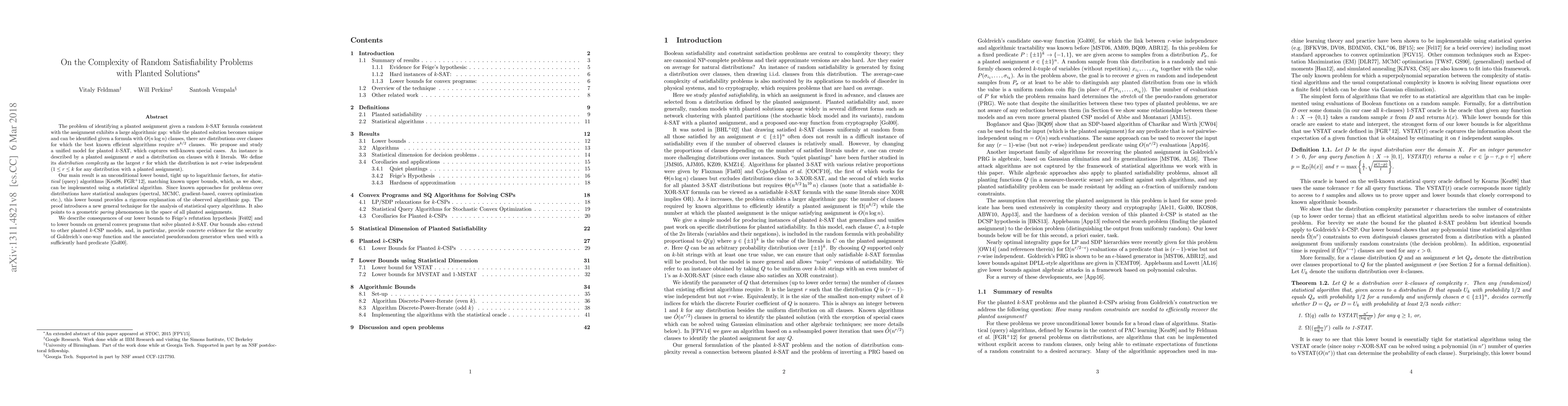 The problem of identifying a planted assignment given a random $k$-SAT formula consistent with the assignment exhibits a large algorithmic gap: while the planted solution becomes unique and can be identified given a formula with $O(n\log n)$ clauses, there are distributions over clauses for which the best known efficient algorithms require $n^{k/2}$ clauses. We propose and study a unified model for planted $k$-SAT, which captures well-known special cases. An instance is described by a planted assignment $\sigma$ and a distribution on clauses with $k$ literals. We define its distribution complexity as the largest $r$ for which the distribution is not $r$-wise independent ($1 \le r \le k$ for any distribution with a planted assignment). Our main result is an unconditional lower bound, tight up to logarithmic factors, for statistical (query) algorithms [Kearns 1998, Feldman et. al 2012], matching known upper bounds, which, as we show, can be implemented using a statistical algorithm. Since known approaches for problems over distributions have statistical analogues (spectral, MCMC, gradient-based, convex optimization etc.), this lower bound provides a rigorous explanation of the observed algorithmic gap. The proof introduces a new general technique for the analysis of statistical query algorithms. It also points to a geometric paring phenomenon in the space of all planted assignments. We describe consequences of our lower bounds to Feige's refutation hypothesis [Feige 2002] and to lower bounds on general convex programs that solve planted $k$-SAT. Our bounds also extend to other planted $k$-CSP models, and, in particular, provide concrete evidence for the security of Goldreich's one-way function and the associated pseudorandom generator when used with a sufficiently hard predicate [Goldreich 2000].