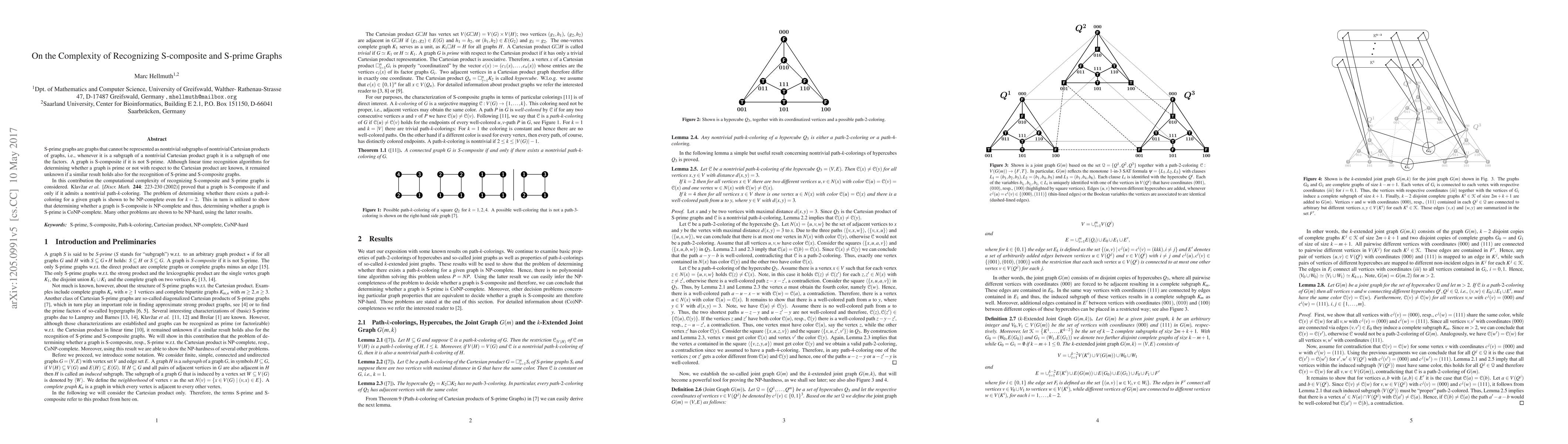 S-prime graphs are graphs that cannot be represented as nontrivial subgraphs of nontrivial Cartesian products of graphs, i.e., whenever it is a subgraph of a nontrivial Cartesian product graph it is a subgraph of one the factors. A graph is S-composite if it is not S-prime. Although linear time recognition algorithms for determining whether a graph is prime or not with respect to the Cartesian product are known, it remained unknown if a similar result holds also for the recognition of S-prime and S-composite graphs. In this contribution the computational complexity of recognizing S-composite and S-prime graphs is considered. Klav{\v{z}}ar \emph{et al.} [\emph{Discr.\ Math.} \textbf{244}: 223-230 (2002)] proved that a graph is S-composite if and only if it admits a nontrivial path-$k$-coloring. The problem of determining whether there exists a path-$k$-coloring for a given graph is shown to be NP-complete even for $k=2$. This in turn is utilized to show that determining whether a graph is S-composite is NP-complete and thus, determining whether a graph is S-prime is CoNP-complete. Many other problems are shown to be NP-hard, using the latter results.