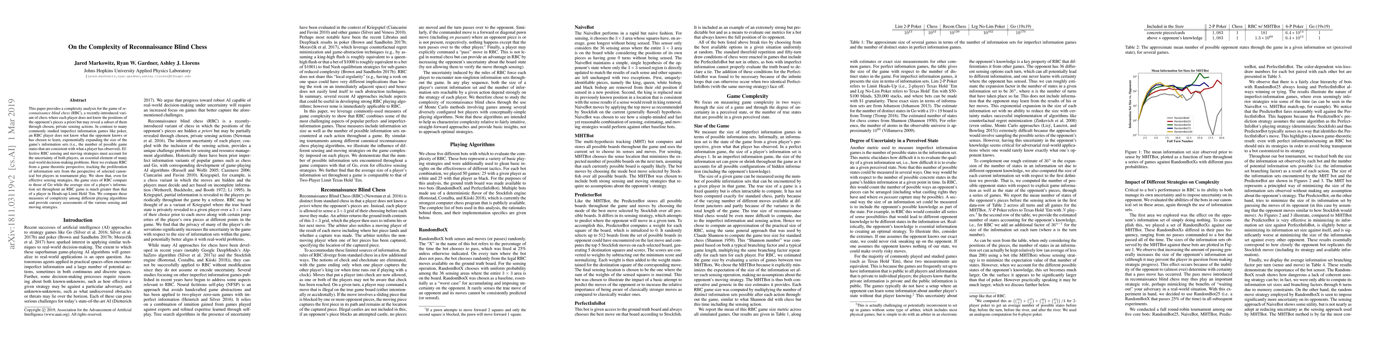 This paper provides a complexity analysis for the game of reconnaissance blind chess (RBC), a recently-introduced variant of chess where each player does not know the positions of the opponent's pieces a priori but may reveal a subset of them through chosen, private sensing actions. In contrast to many commonly studied imperfect information games like poker, an RBC player does not know what the opponent knows or has chosen to learn, exponentially expanding the size of the game's information sets (i.e., the number of possible game states that are consistent with what a player has observed). Effective RBC sensing and moving strategies must account for the uncertainty of both players, an essential element of many real-world decision-making problems. Here we evaluate RBC from a game theoretic perspective, tracking the proliferation of information sets from the perspective of selected canonical bot players in tournament play. We show that, even for effective sensing strategies, the game sizes of RBC compare to those of Go while the average size of a player's information set throughout an RBC game is much greater than that of a player in Heads-up Limit Hold 'Em. We compare these measures of complexity among different playing algorithms and provide cursory assessments of the various sensing and moving strategies.
