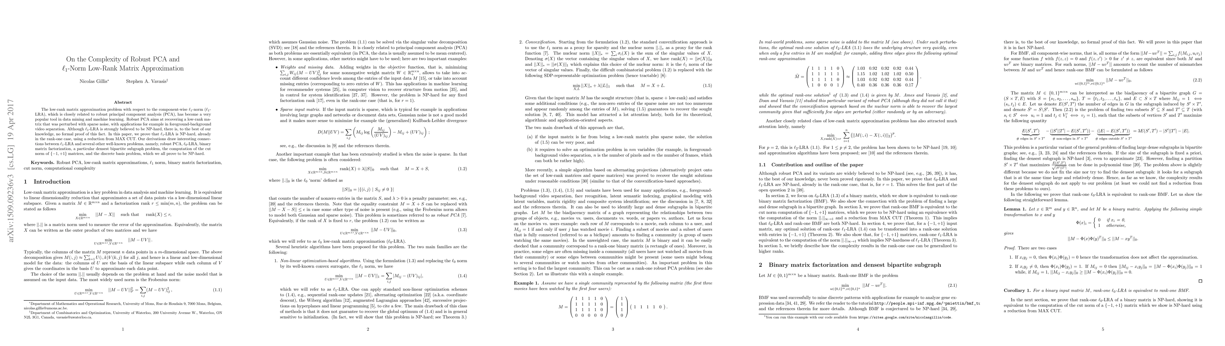 This paper proves the NP-hardness of the $\ell_1$-LRA problem, establishing a strong connection between it and robust PCA, and demonstrating its complexity through reductions from MAX CUT and other related problems, including $\ell_0$-LRA, binary matrix factorization, and the densest bipartite subgraph problem.