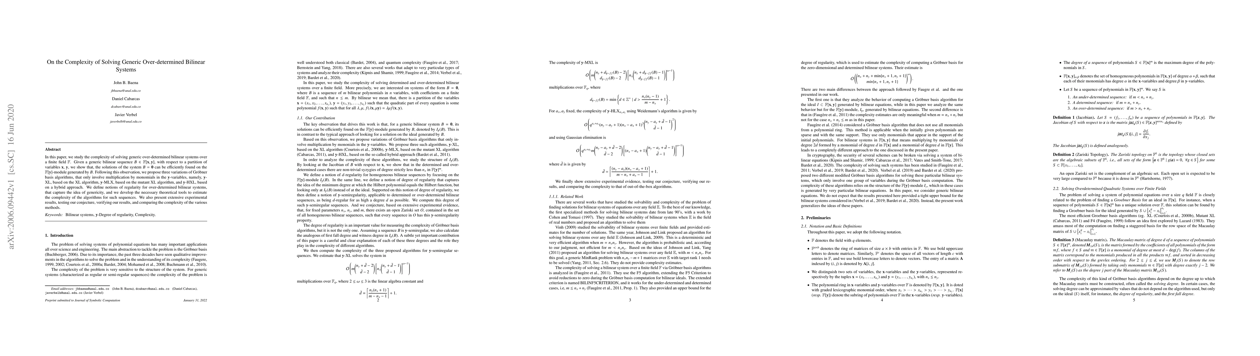 In this paper, we study the complexity of solving generic over-determined bilinear systems over a finite field $\mathbb{F}$. Given a generic bilinear sequence $B \in \mathbb{F}[\mathbf{x},\mathbf{y}]$, with respect to a partition of variables $\mathbf{x}$, $\mathbf{y}$, we show that, the solutions of the system $B= \mathbf{0}$ can be efficiently found on the $\mathbb{F}[\mathbf{y}]$-module generated by $B$. Following this observation, we propose three variations of Gr\"obner basis algorithms, that only involve multiplication by monomials in they-variables, namely, $\mathbf{y}$-XL, based on the XL algorithm, $\mathbf{y}$-MLX, based on the mutant XL algorithm, and $\mathbf{y}$-HXL, basedon a hybrid approach. We define notions of regularity for over-determined bilinear systems,that capture the idea of genericity, and we develop the necessary theoretical tools to estimate the complexity of the algorithms for such sequences. We also present extensive experimental results, testing our conjecture, verifying our results, and comparing the complexity of the various methods.