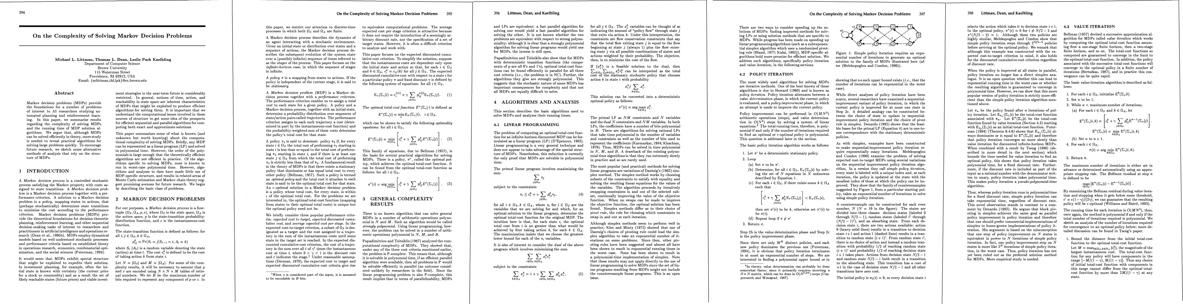 The complexity of solving Markov Decision Problems (MDPs) is a complex issue, with efficient solutions possible in theory but requiring further research for practical applications. Alternative methods of analysis focusing on MDP structure could help reveal more efficient algorithms.