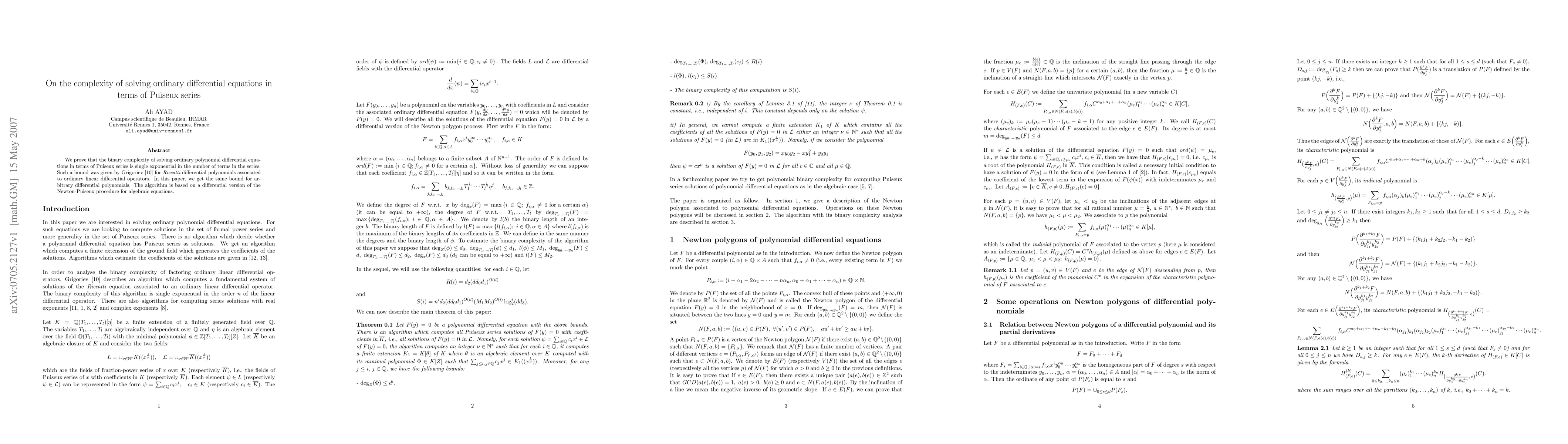 Summary: This paper establishes that solving ordinary polynomial differential equations using Puiseux series results in a single exponential complexity in terms of the number of series terms, extending Grigoriev's prior work to all differential polynomials via a differential Newton-Puiseux algorithm.