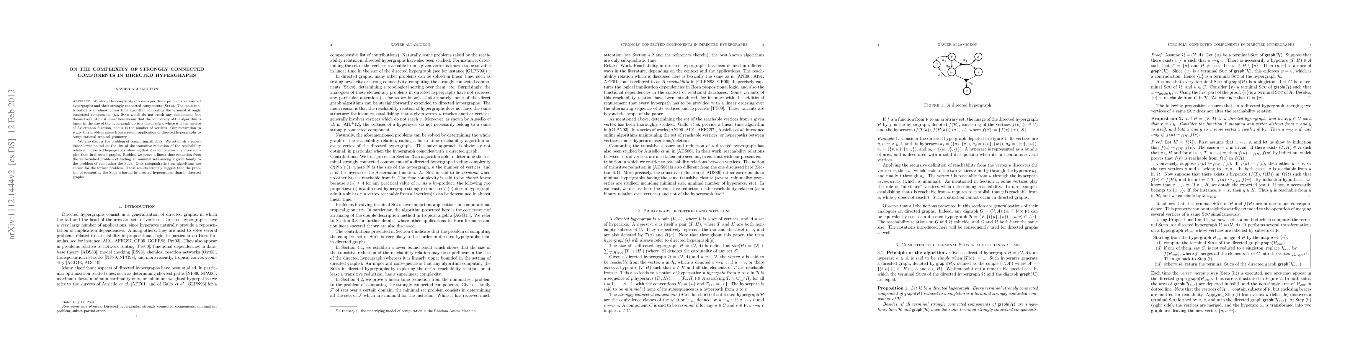 We study the complexity of some algorithmic problems on directed hypergraphs and their strongly connected components (SCCs). The main contribution is an almost linear time algorithm computing the terminal strongly connected components (i.e. SCCs which do not reach any components but themselves). "Almost linear" here means that the complexity of the algorithm is linear in the size of the hypergraph up to a factor alpha(n), where alpha is the inverse of Ackermann function, and n is the number of vertices. Our motivation to study this problem arises from a recent application of directed hypergraphs to computational tropical geometry. We also discuss the problem of computing all SCCs. We establish a superlinear lower bound on the size of the transitive reduction of the reachability relation in directed hypergraphs, showing that it is combinatorially more complex than in directed graphs. Besides, we prove a linear time reduction from the well-studied problem of finding all minimal sets among a given family to the problem of computing the SCCs. Only subquadratic time algorithms are known for the former problem. These results strongly suggest that the problem of computing the SCCs is harder in directed hypergraphs than in directed graphs.