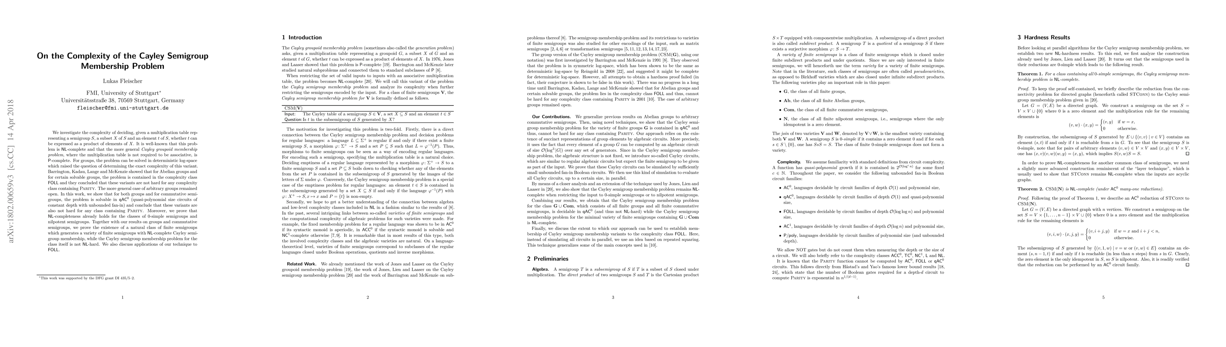 This paper investigates the complexity of the Cayley semigroup membership problem, showing it is solvable in qAC^0 for both groups and commutative semigroups, indicating it is not hard for classes containing PARITY. It also establishes NL-completeness for 0-simple and nilpotent semigroups.
