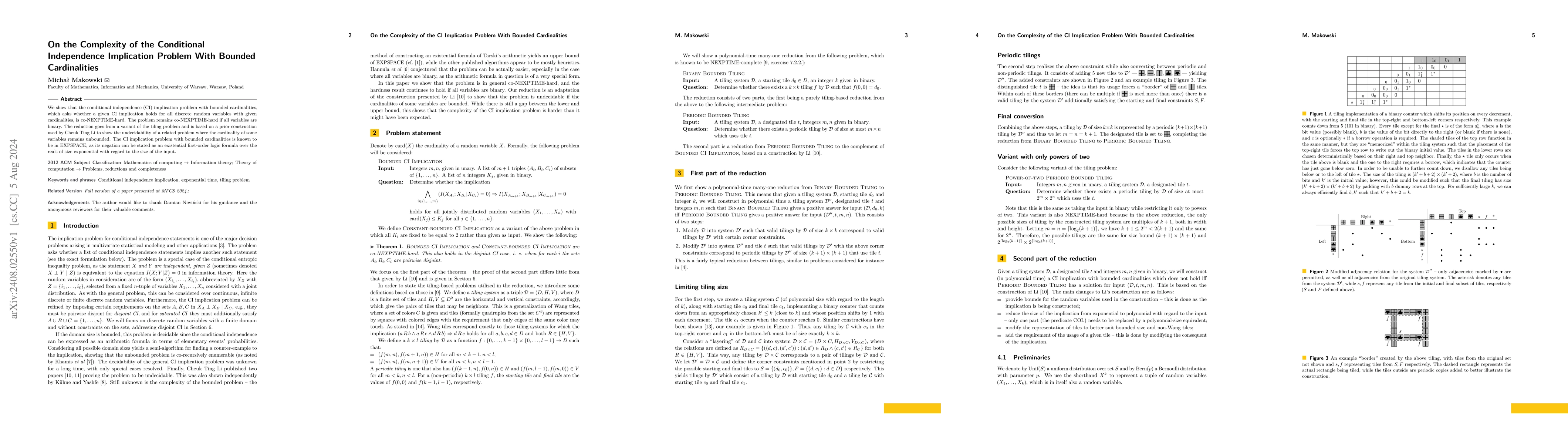 This paper demonstrates that the conditional independence implication problem with bounded cardinalities is co-NEXPTIME-hard, even when all variables are binary. The proof involves a reduction from a variant of the tiling problem, establishing its complexity beyond EXPSPACE.