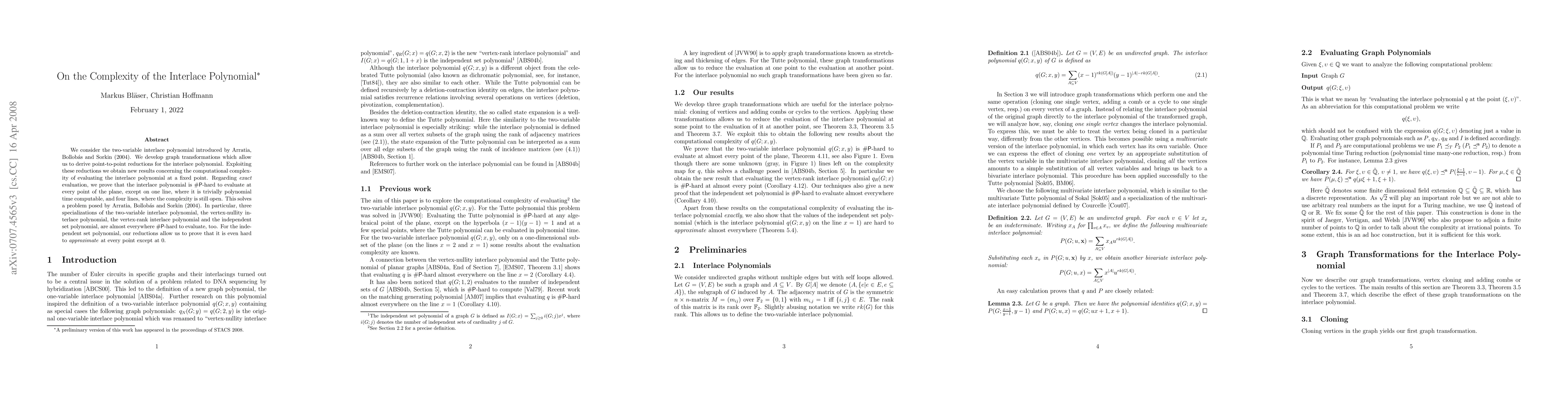 This paper explores the computational complexity of the interlace polynomial, proving it is #P-hard to evaluate almost everywhere except on a few specific lines. It also demonstrates that several specializations, including the independent set polynomial, share similar complexity challenges.