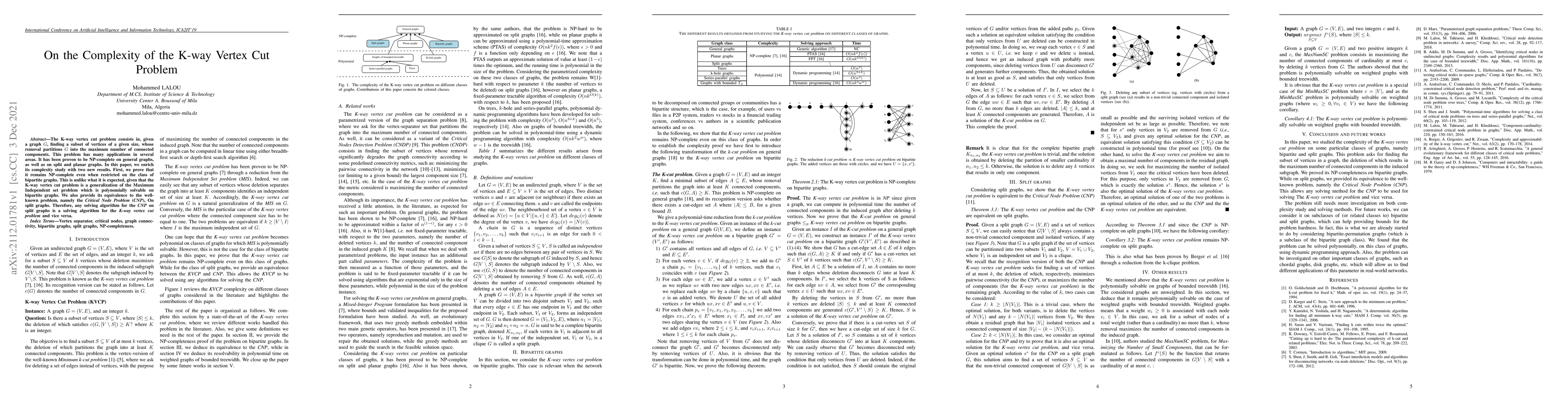 The K-way vertex cut problem remains NP-complete even in bipartite graphs, with a new equivalence to the Critical Node Problem on split graphs found.