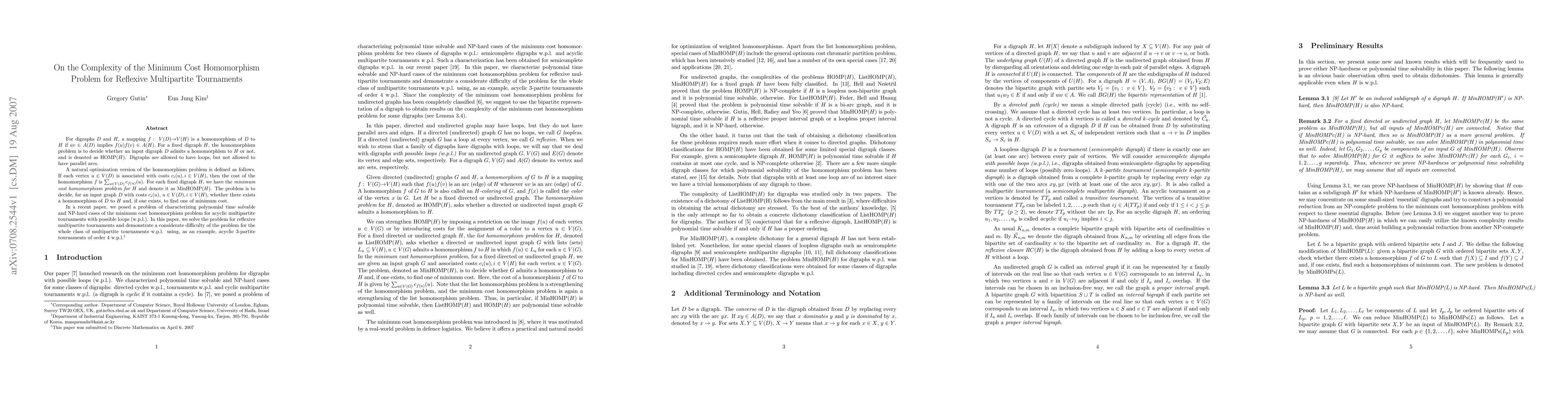 For digraphs $D$ and $H$, a mapping $f: V(D)\dom V(H)$ is a homomorphism of $D$ to $H$ if $uv\in A(D)$ implies $f(u)f(v)\in A(H).$ For a fixed digraph $H$, the homomorphism problem is to decide whether an input digraph $D$ admits a homomorphism to $H$ or not, and is denoted as HOMP($H$). Digraphs are allowed to have loops, but not allowed to have parallel arcs. A natural optimization version of the homomorphism problem is defined as follows. If each vertex $u \in V(D)$ is associated with costs $c_i(u), i \in V(H)$, then the cost of the homomorphism $f$ is $\sum_{u\in V(D)}c_{f(u)}(u)$. For each fixed digraph $H$, we have the {\em minimum cost homomorphism problem for} $H$ and denote it as MinHOMP($H$). The problem is to decide, for an input graph $D$ with costs $c_i(u),$ $u \in V(D), i\in V(H)$, whether there exists a homomorphism of $D$ to $H$ and, if one exists, to find one of minimum cost. In a recent paper, we posed a problem of characterizing polynomial time solvable and NP-hard cases of the minimum cost homomorphism problem for acyclic multipartite tournaments with possible loops (w.p.l.). In this paper, we solve the problem for reflexive multipartite tournaments and demonstrate a considerate difficulty of the problem for the whole class of multipartite tournaments w.p.l. using, as an example, acyclic 3-partite tournaments of order 4 w.p.l.\footnote{This paper was submitted to Discrete Mathematics on April 6, 2007}
