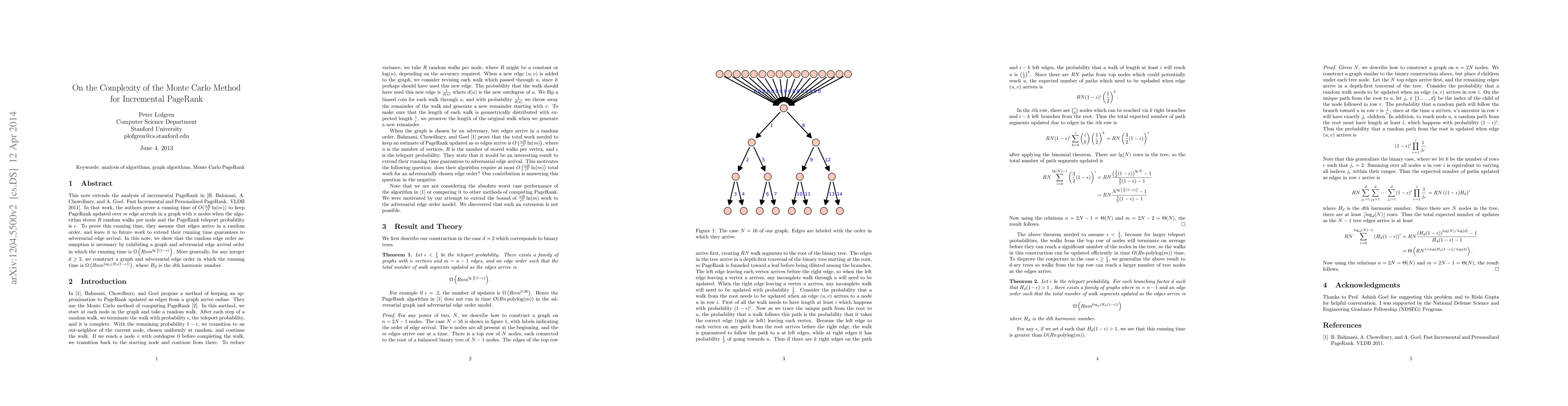 This paper extends the analysis of incremental PageRank, showing that the running time of $O(\frac{nR}{\epsilon^2} \ln(m))$ is contingent on the assumption of random edge arrival order. It demonstrates that adversarial edge arrival can significantly increase the running time, reaching $\Omega \left(R n m^{\lg{\frac{3}{2}(1-\epsilon)}}\right)$ in the worst case.
