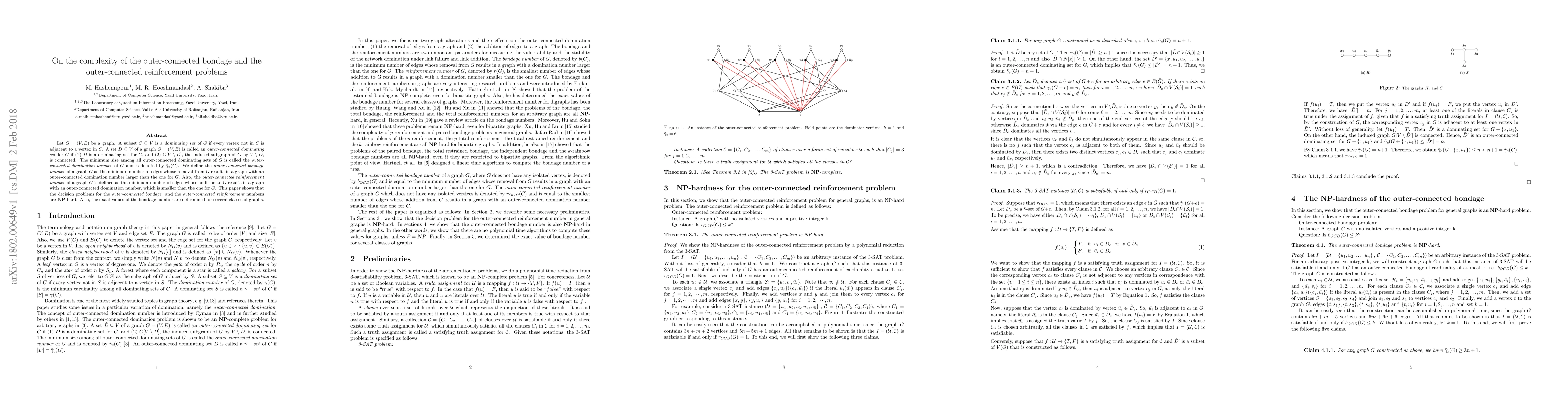 This paper investigates the complexity of the outer-connected bondage and reinforcement problems in graphs, proving that the associated decision problems are NP-hard. It also determines the exact values of the outer-connected bondage number for specific graph classes.