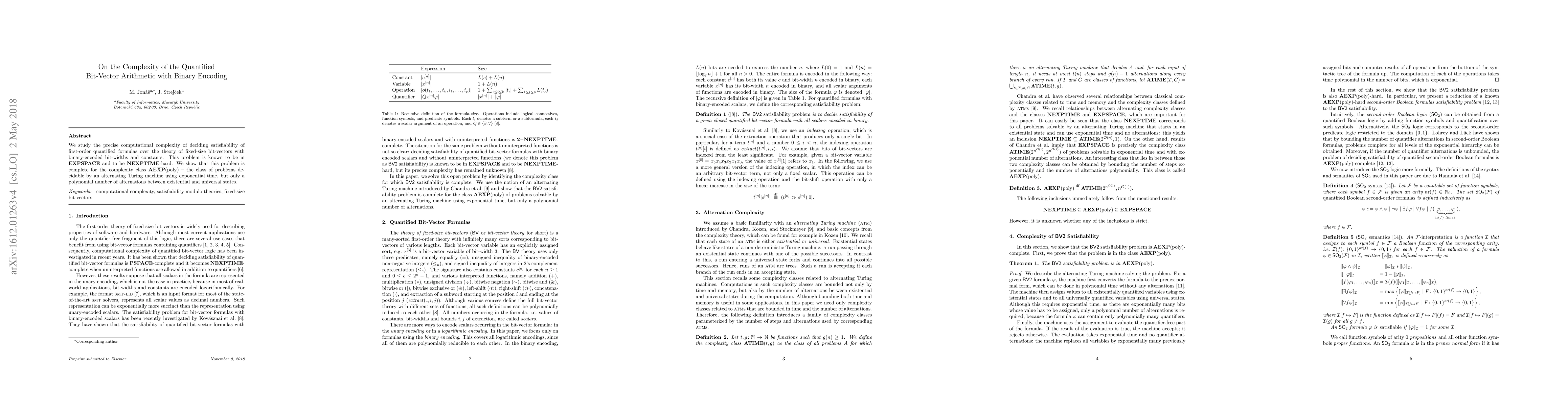 Researchers studied the complexity of a problem involving bit-vector arithmetic with binary encoding, finding it is complete for the AEXP(poly) class, which deals with alternating Turing machines using exponential time and polynomial alternations.