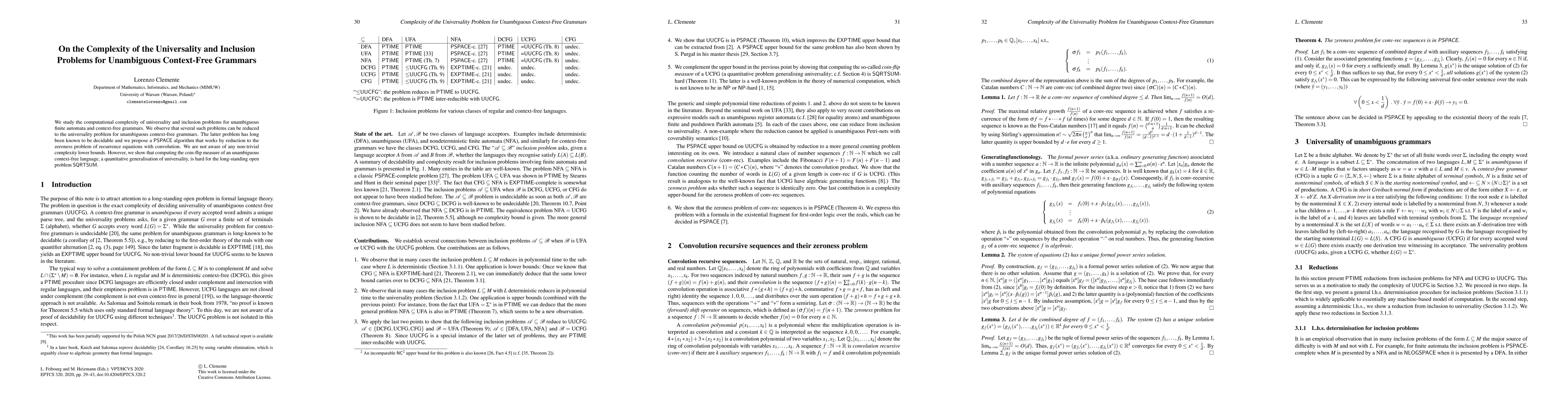 This paper investigates the computational complexity of universality and inclusion problems for unambiguous context-free grammars, proposing a PSPACE algorithm for the universality problem via convolution recurrence equations. It highlights the difficulty of computing the coin-flip measure of such languages, linking it to the SQRTSUM problem.