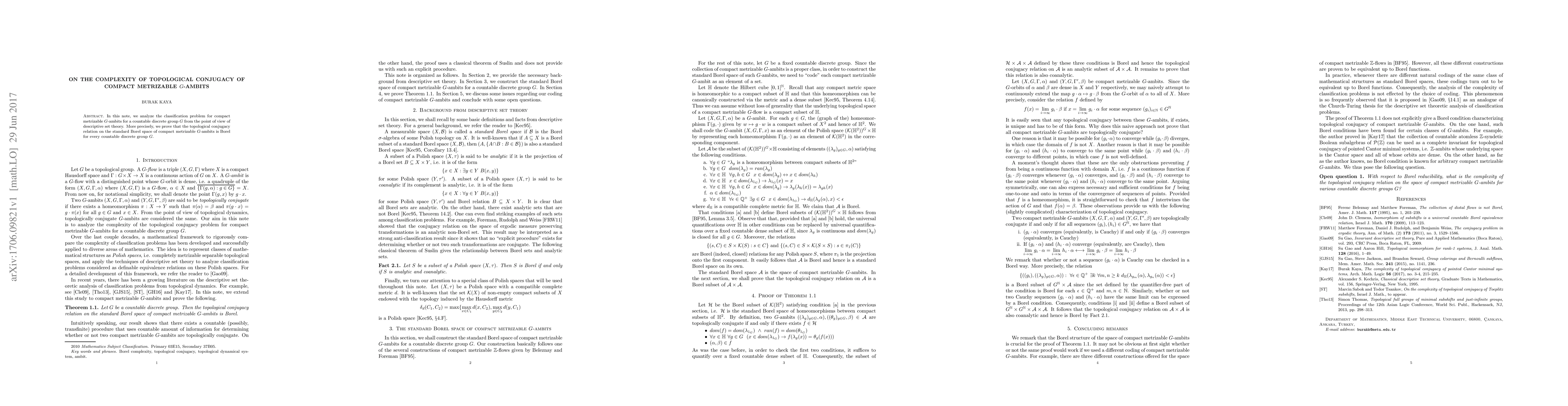 The study proves that topological conjugacy of compact metrizable G-ambits is a Borel relation for countable discrete groups G. This classification problem is approached through descriptive set theory.