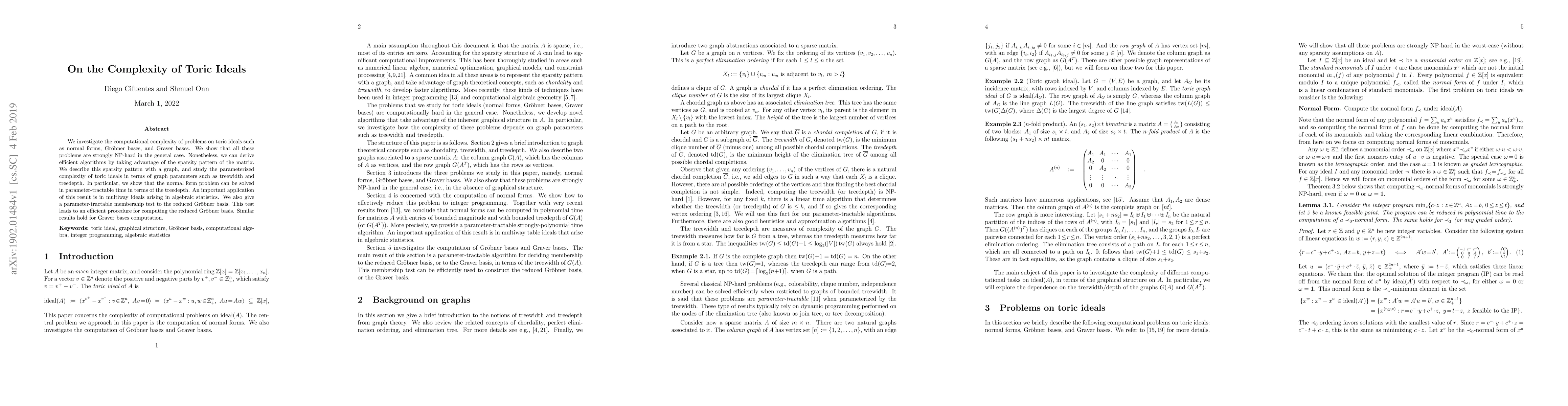 This paper explores the computational complexity of toric ideals, proving that problems like normal forms, Gröbner bases, and Graver bases are strongly NP-hard. However, it demonstrates efficient algorithms leveraging the sparsity pattern of the matrix, showing parameter-tractable solutions for normal form problems based on treedepth and providing efficient procedures for computing reduced Gröbner and Graver bases.