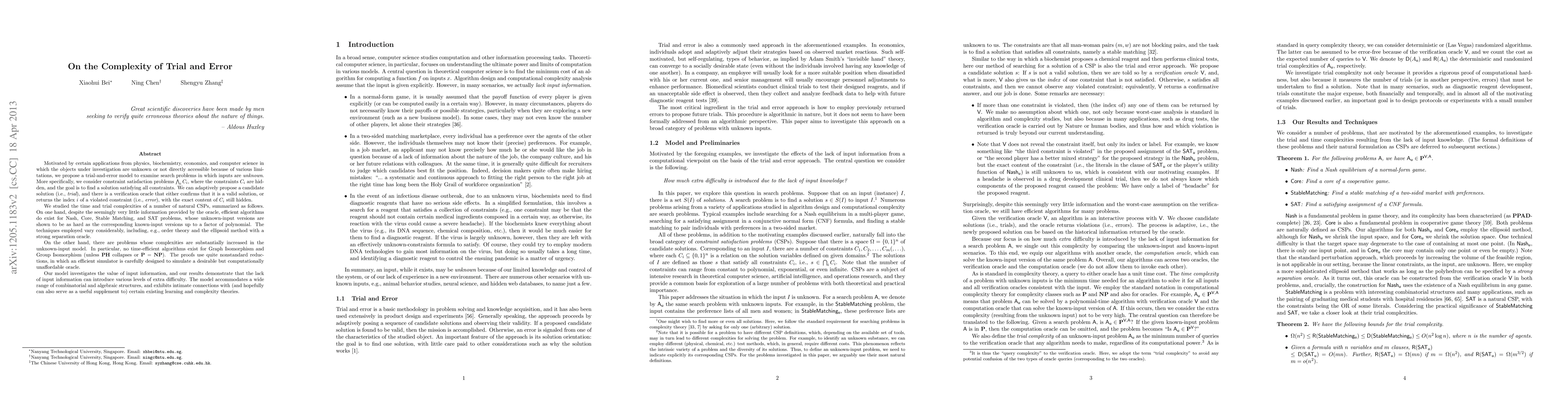 Motivated by certain applications from physics, biochemistry, economics, and computer science, in which the objects under investigation are not accessible because of various limitations, we propose a trial-and-error model to examine algorithmic issues in such situations. Given a search problem with a hidden input, we are asked to find a valid solution, to find which we can propose candidate solutions (trials), and use observed violations (errors), to prepare future proposals. In accordance with our motivating applications, we consider the fairly broad class of constraint satisfaction problems, and assume that errors are signaled by a verification oracle in the format of the index of a violated constraint (with the content of the constraint still hidden). Our discoveries are summarized as follows. On one hand, despite the seemingly very little information provided by the verification oracle, efficient algorithms do exist for a number of important problems. For the Nash, Core, Stable Matching, and SAT problems, the unknown-input versions are as hard as the corresponding known-input versions, up to a factor of polynomial. We further give almost tight bounds on the latter two problems' trial complexities. On the other hand, there are problems whose complexities are substantially increased in the unknown-input model. In particular, no time-efficient algorithms exist (under standard hardness assumptions) for Graph Isomorphism and Group Isomorphism problems. The tools used to achieve these results include order theory, strong ellipsoid method, and some non-standard reductions. Our model investigates the value of information, and our results demonstrate that the lack of input information can introduce various levels of extra difficulty. The model exhibits intimate connections with (and we hope can also serve as a useful supplement to) certain existing learning and complexity theories.