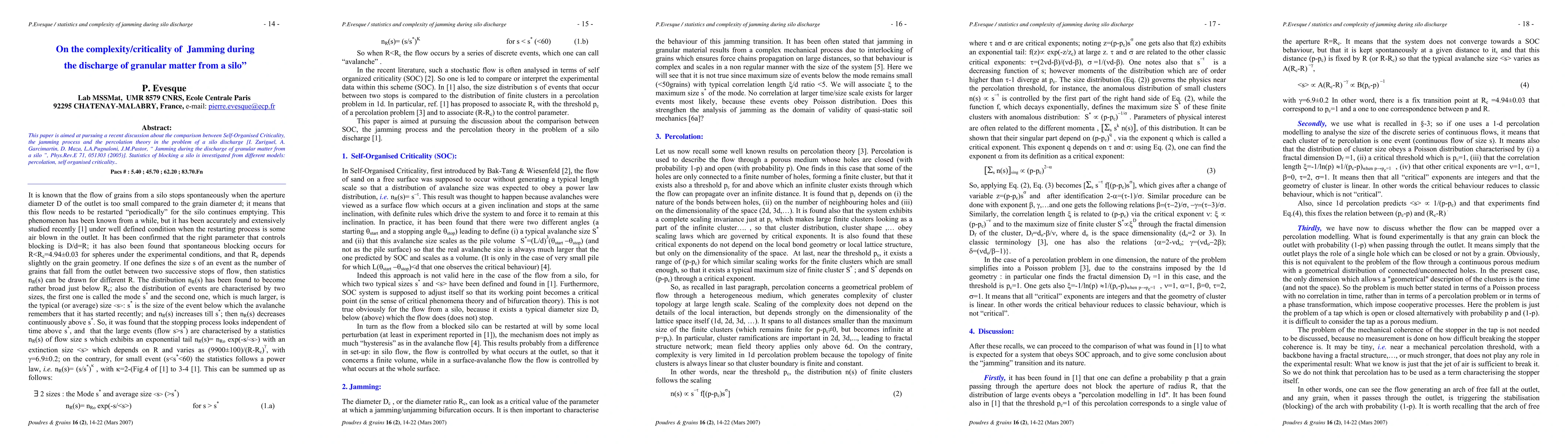 This paper is aimed at pursuing a recent discussion about the comparison between Self-Organised Criticality, the jamming process and the percolation theory in the problem of a silo discharge [I. Zuriguel, A. Garcimartin, D. Maza, L.A.Pugnaloni, J.M.Pastor, "Jamming during the discharge of granular matter from a silo", Phys.Rev.E 71, 051303 (2005)]. Statistics of blocking a silo is investigated from different models: percolation, self organised criticality..