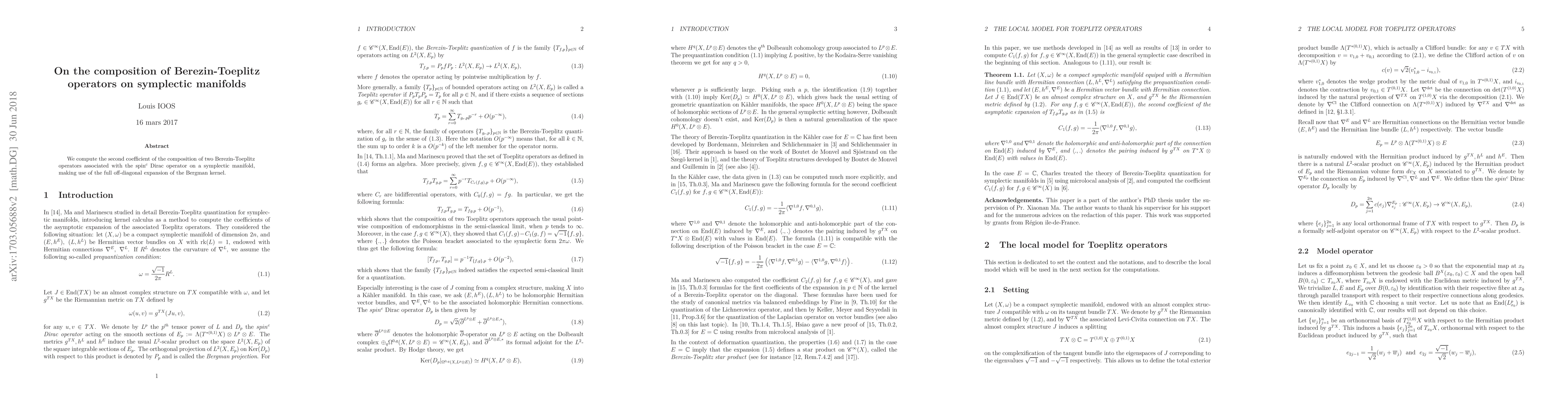 Summary: This paper calculates the second coefficient in the composition of two Berezin-Toeplitz operators linked to the spin^c Dirac operator on a symplectic manifold, utilizing the full-off diagonal expansion of the Bergman kernel.
