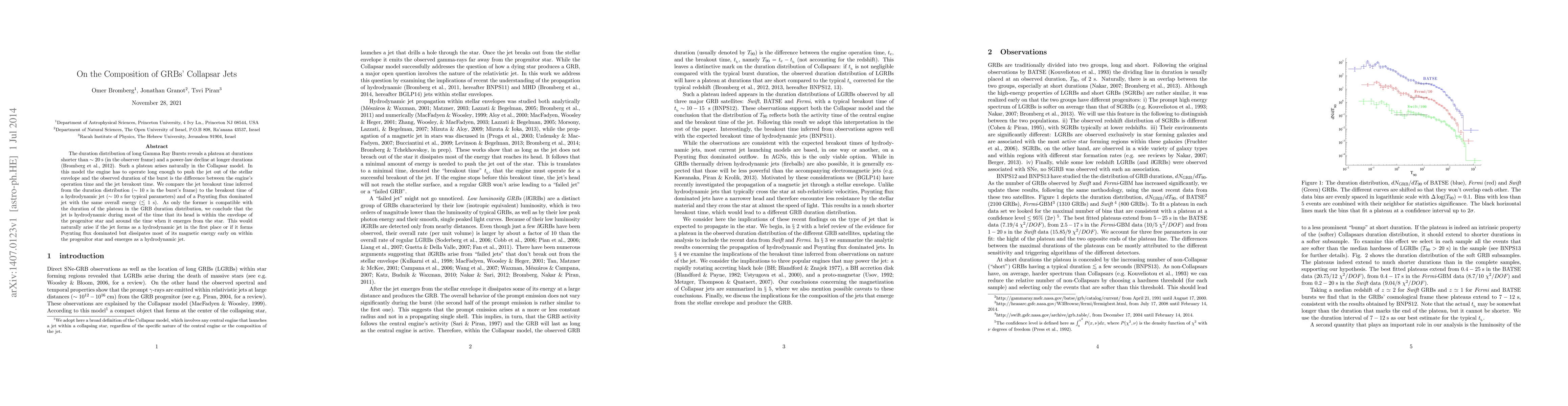 The paper investigates the composition of Gamma Ray Burst (GRB) collapsar jets, concluding that they are primarily hydrodynamic during breakout from the progenitor star. This is inferred from comparing observed GRB durations to models of hydrodynamic and Poynting flux dominated jets. The findings suggest jets initially form hydrodynamically or transition from magnetic to hydrodynamic dominance early within the star.