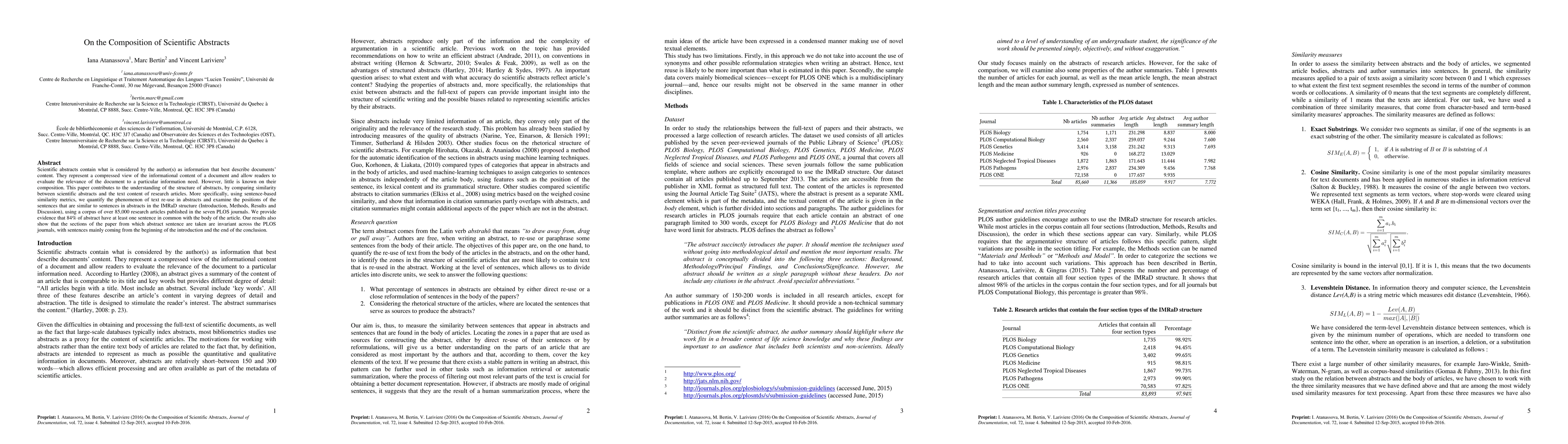Scientific abstracts reuse sentences from research articles' body with high frequency, with most similar sentences coming from the introduction's beginning and conclusion's end.