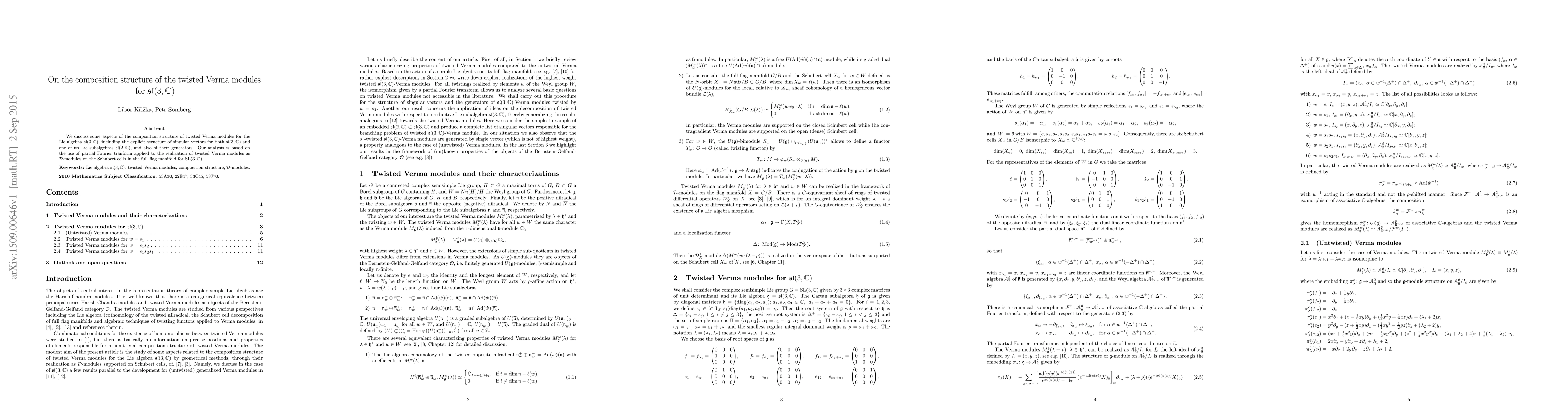 We discuss some aspects of the composition structure of twisted Verma modules for the Lie algebra $\mathfrak{sl}(3, \mathbb{C})$, including the explicit structure of singular vectors for both $\mathfrak{sl}(3, \mathbb{C})$ and one of its Lie subalgebras $\mathfrak{sl}(2, \mathbb{C})$, and also of their generators. Our analysis is based on the use of partial Fourier tranform applied to the realization of twisted Verma modules as $\mathrm{{D}}$-modules on the Schubert cells in the full flag manifold for $\mathrm{SL}(3, \mathbb{C})$.