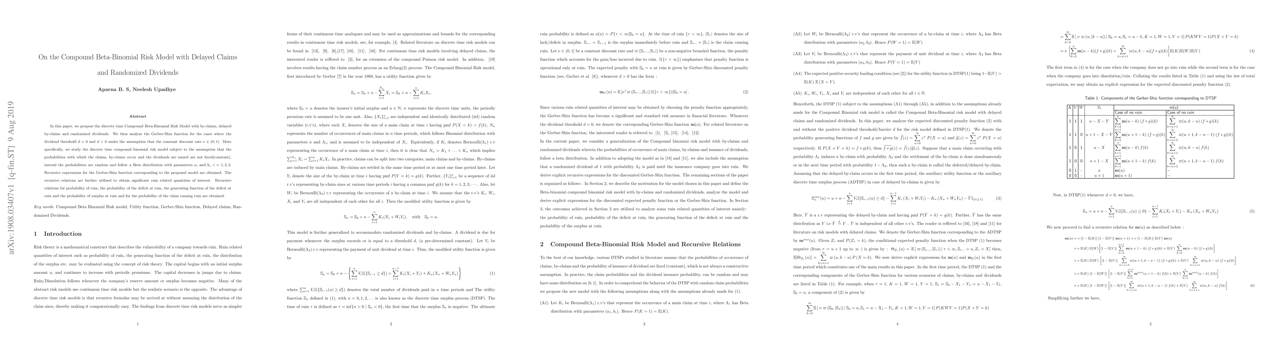 In this paper, we propose the discrete time Compound Beta-Binomial Risk Model with by-claims, delayed by-claims and randomized dividends. We then analyze the Gerber-Shiu function for the cases where the dividend threshold $d=0$ and $d>0$ under the assumption that the constant discount rate $\nu \in (0,1)$. More specifically, we study the discrete time compound binomial risk model subject to the assumption that the probabilities with which the claims, by-claims occur and the dividends are issued are not fixed(constant), instead the probabilities are random and follow a Beta distribution with parameters $a_{i}$ and $b_{i}$, $i = 1, 2, 3$. Recursive expressions for the Gerber-Shiu function corresponding to the proposed model are obtained. The recursive relations are further utilized to obtain significant ruin related quantities of interest. Recursive relations for probability of ruin, the probability of the deficit at ruin, the generating function of the deficit at ruin and the probability of surplus at ruin and for the probability of the claim causing ruin are obtained.
