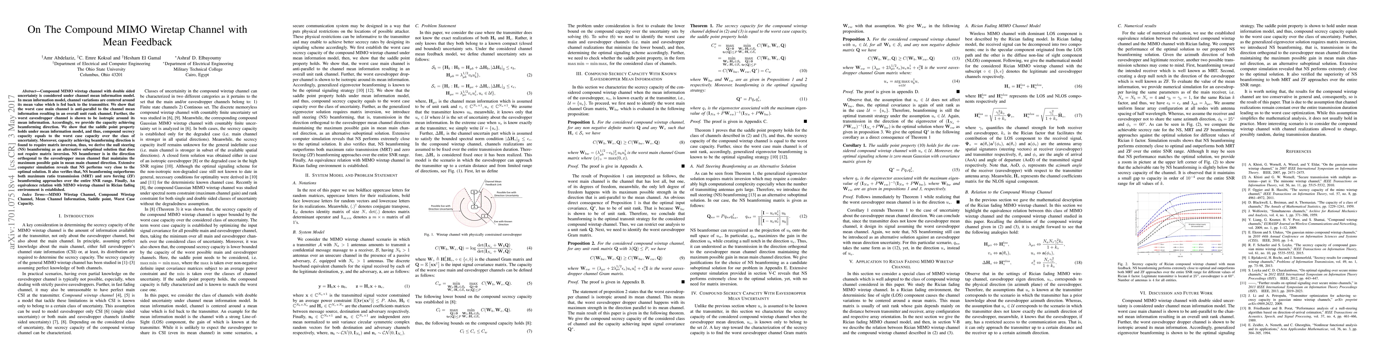 Compound MIMO wiretap channel with double sided uncertainty is considered under channel mean information model. In mean information model, channel variations are centered around its mean value which is fed back to the transmitter. We show that the worst case main channel is anti-parallel to the channel mean information resulting in an overall unit rank channel. Further, the worst eavesdropper channel is shown to be isotropic around its mean information. Accordingly, we provide the capacity achieving beamforming direction. We show that the saddle point property holds under mean information model, and thus, compound secrecy capacity equals to the worst case capacity over the class of uncertainty. Moreover, capacity achieving beamforming direction is found to require matrix inversion, thus, we derive the null steering (NS) beamforming as an alternative suboptimal solution that does not require matrix inversion. NS beamformer is in the direction orthogonal to the eavesdropper mean channel that maintains the maximum possible gain in mean main channel direction. Extensive computer simulation reveals that NS performs very close to the optimal solution. It also verifies that, NS beamforming outperforms both maximum ratio transmission (MRT) and zero forcing (ZF) beamforming approaches over the entire SNR range. Finally, An equivalence relation with MIMO wiretap channel in Rician fading environment is established.
