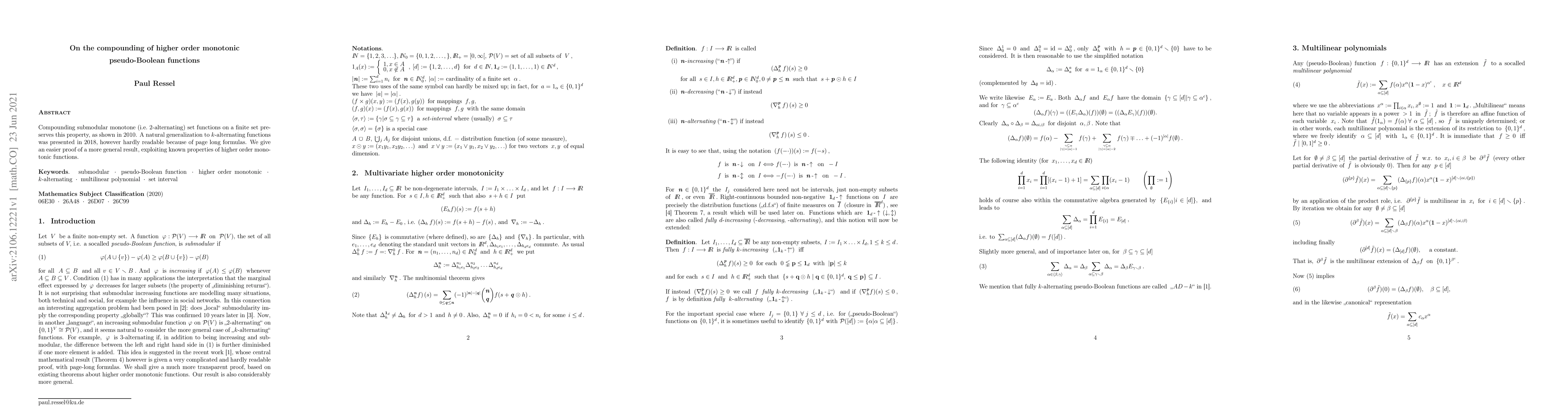 Compounding submodular monotone (i.e. 2-alternating) set functions on a finite set preserves this property, as shown in 2010. A natural generalization to k-alternating functions was presented in 2018, however hardly readable because of page long formulas. We give an easier proof of a more general result, exploiting known properties of higher order monotonic functions.