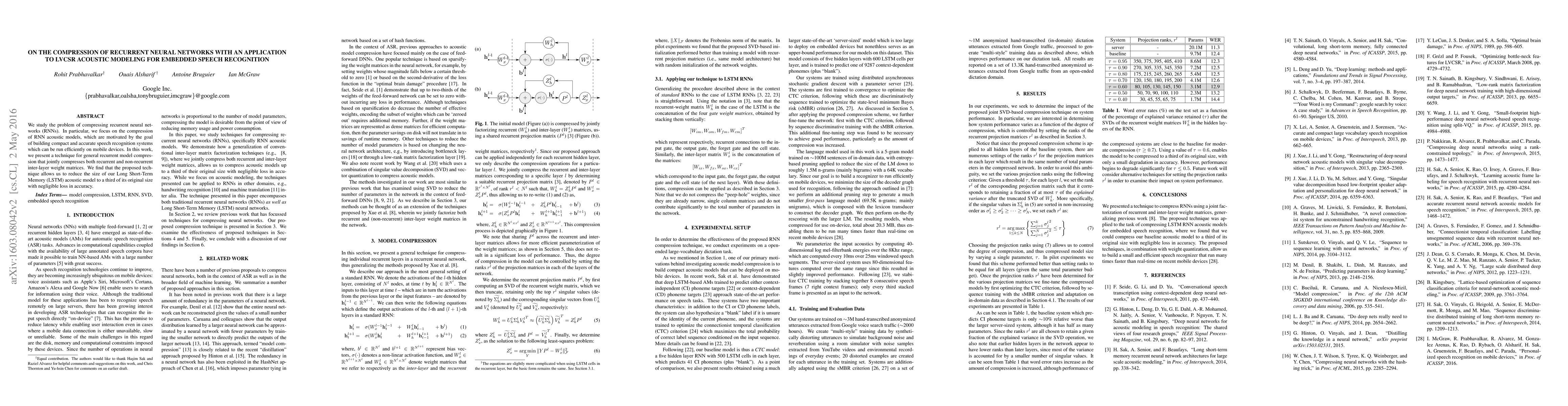 This paper proposes a technique for compressing recurrent neural networks, specifically focusing on RNN acoustic models for embedded speech recognition. The method successfully reduces the size of Long Short-Term Memory (LSTM) models by a third while maintaining accuracy, enabling efficient deployment on mobile devices.