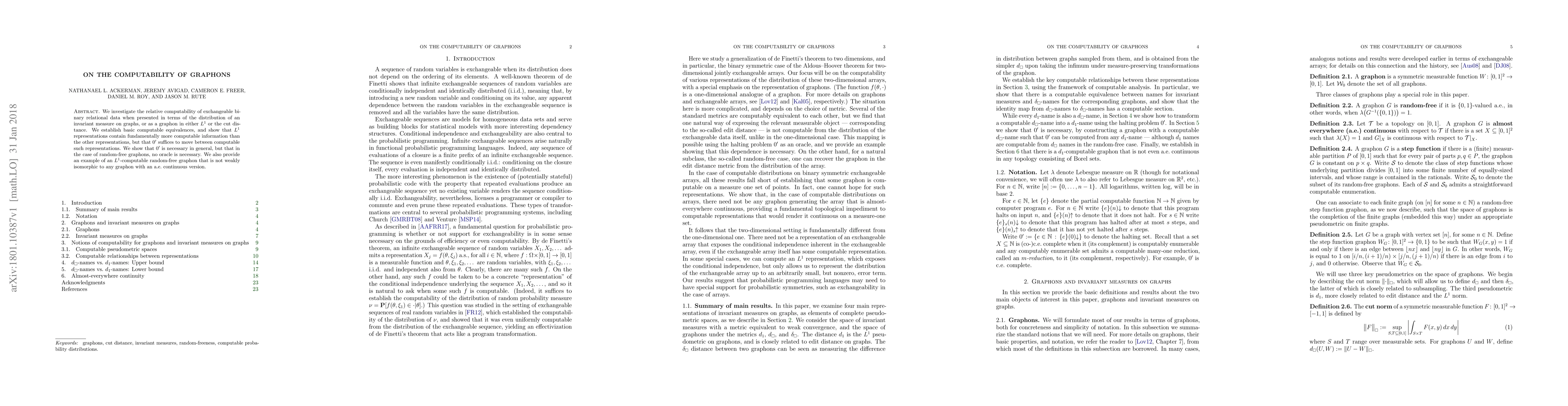 This paper explores the computability of exchangeable binary relational data represented by graphons in $L^1$ or cut distance, establishing that $L^1$ representations hold more computable information. It demonstrates that $0'$ suffices for moving between computable representations, though it is generally necessary, except for random-free graphons.