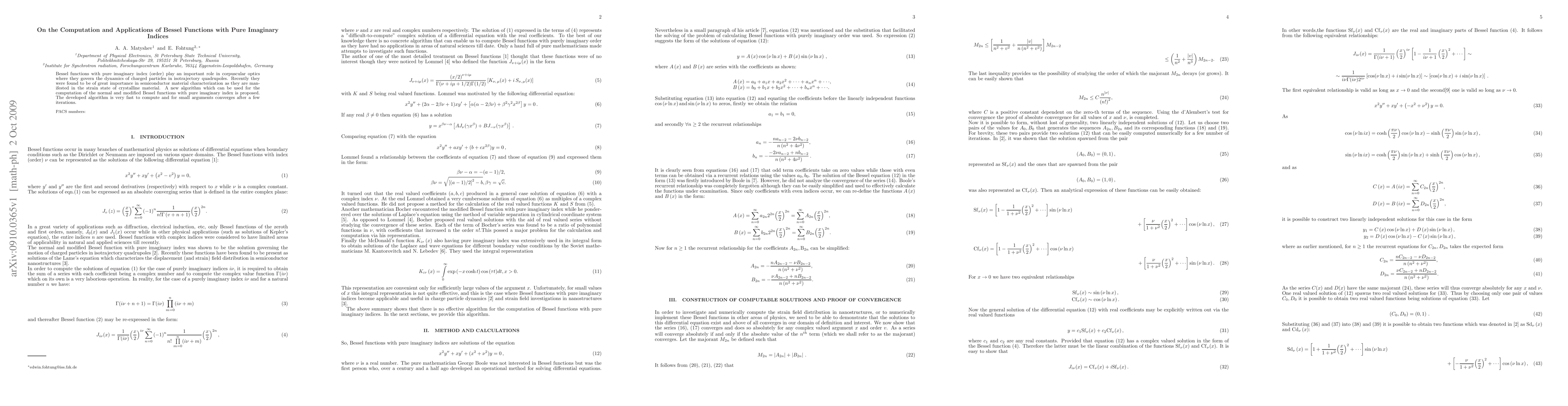 Bessel functions with pure imaginary index (order) play an important role in corpuscular optics where they govern the dynamics of charged particles in isotrajectory quadrupoles. Recently they were found to be of great importance in semiconductor material characterization as they are manifested in the strain state of crystalline material. A new algorithm which can be used for the computation of the normal and modifed Bessel functions with pure imaginary index is proposed. The developed algorithm is very fast to compute and for small arguments converges after a few iterations.