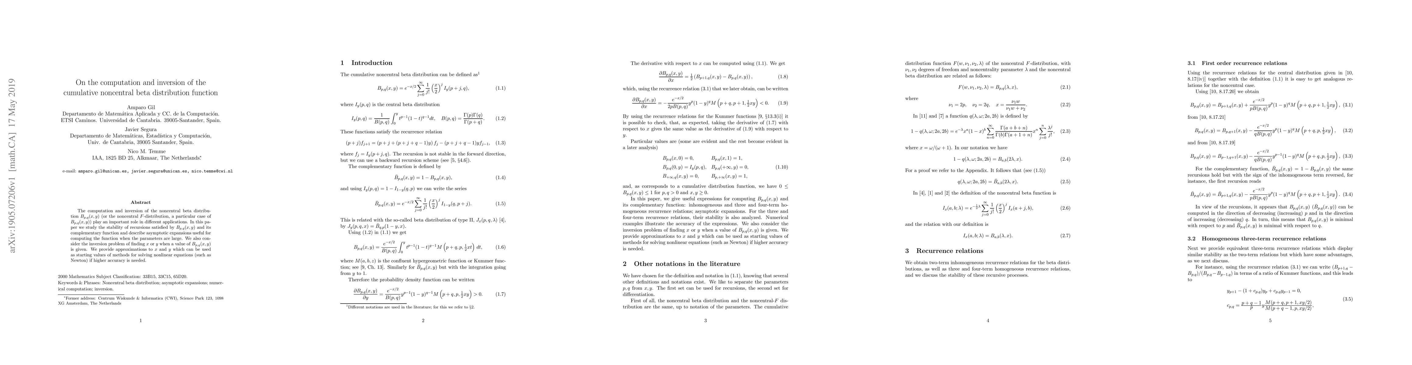 This paper investigates the stability of recursions and asymptotic expansions for computing the cumulative noncentral beta distribution function, $B_{p,q}(x,y)$, and its complementary function. It also addresses the inversion problem, providing approximations for $x$ and $y$ to aid in solving nonlinear equations when higher accuracy is required.