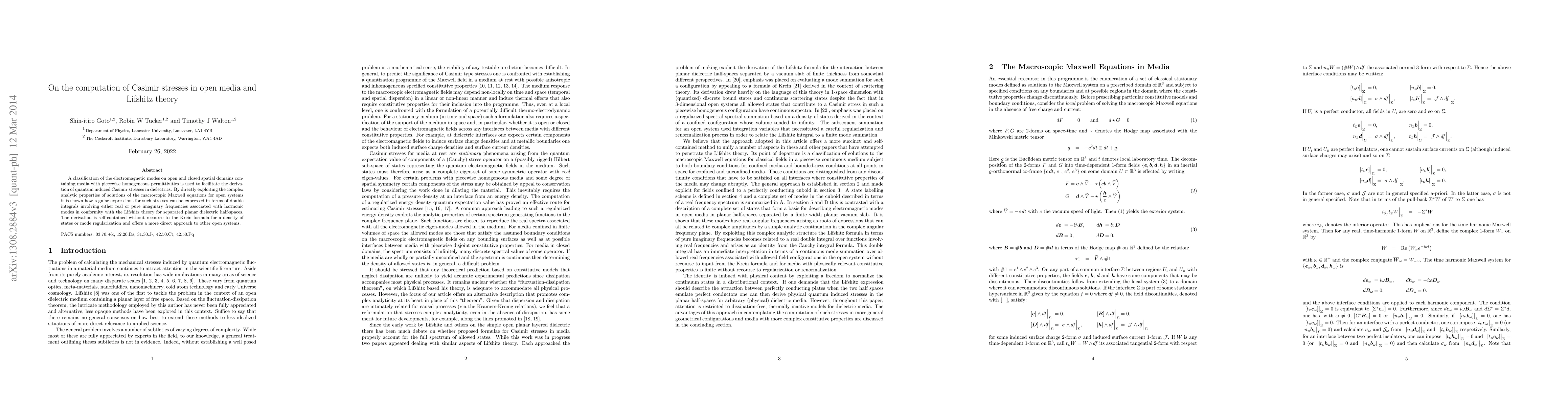 A classification of the electromagnetic modes on open and closed spatial domains containing media with piecewise homogeneous permittivities is used to facilitate the derivation of quantum induced Casimir stresses in dielectrics. By directly exploiting the complex analytic properties of solutions of the macroscopic Maxwell equations for open systems it is shown how regular expressions for such stresses can be expressed in terms of double integrals involving either real or pure imaginary frequencies associated with harmonic modes in conformity with the Lifshitz theory for separated planar dielectric half-spaces. The derivation is self-contained without recourse to the Krein formula for a density of states or mode regularization and offers a more direct approach to other open systems.