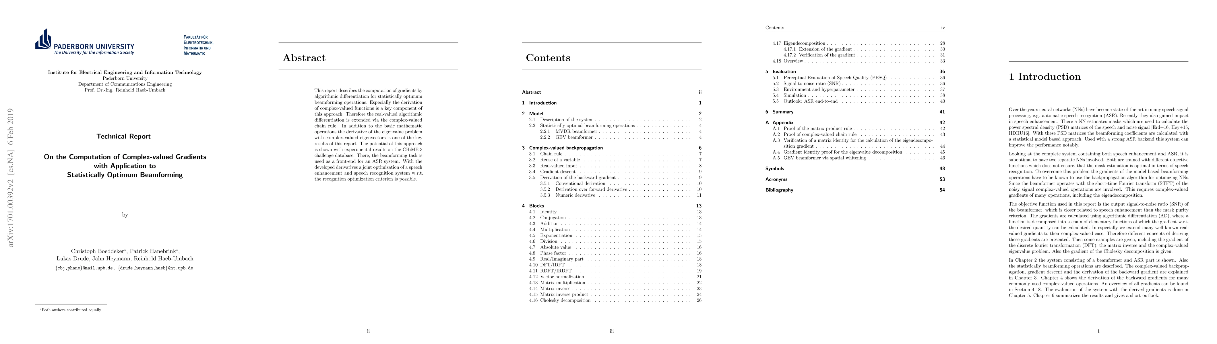 This report describes the computation of gradients by algorithmic differentiation for statistically optimum beamforming operations. Especially the derivation of complex-valued functions is a key component of this approach. Therefore the real-valued algorithmic differentiation is extended via the complex-valued chain rule. In addition to the basic mathematic operations the derivative of the eigenvalue problem with complex-valued eigenvectors is one of the key results of this report. The potential of this approach is shown with experimental results on the CHiME-3 challenge database. There, the beamforming task is used as a front-end for an ASR system. With the developed derivatives a joint optimization of a speech enhancement and speech recognition system w.r.t. the recognition optimization criterion is possible.