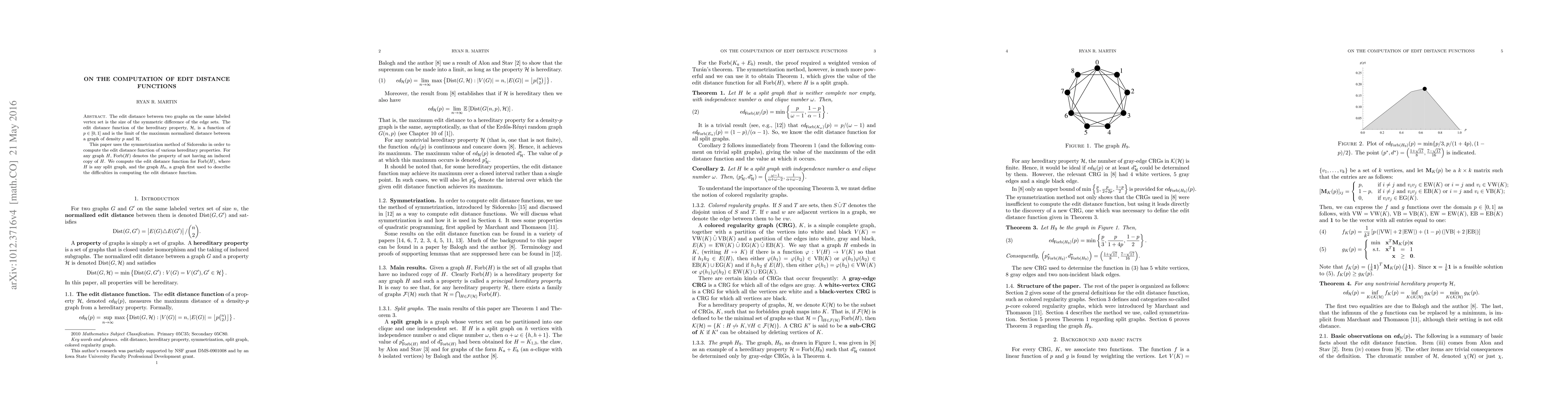 The edit distance between two graphs on the same labeled vertex set is the size of the symmetric difference of the edge sets. The edit distance function of the hereditary property, $\mathcal{H}$, is a function of $p\in[0,1]$ and is the limit of the maximum normalized distance between a graph of density $p$ and $\mathcal{H}$. This paper uses the symmetrization method of Sidorenko in order to compute the edit distance function of various hereditary properties. For any graph $H$, ${\rm Forb}(H)$ denotes the property of not having an induced copy of $H$. We compute the edit distance function for ${\rm Forb}(H)$, where $H$ is any split graph, and the graph $H_9$, a graph first used to describe the difficulties in computing the edit distance function.