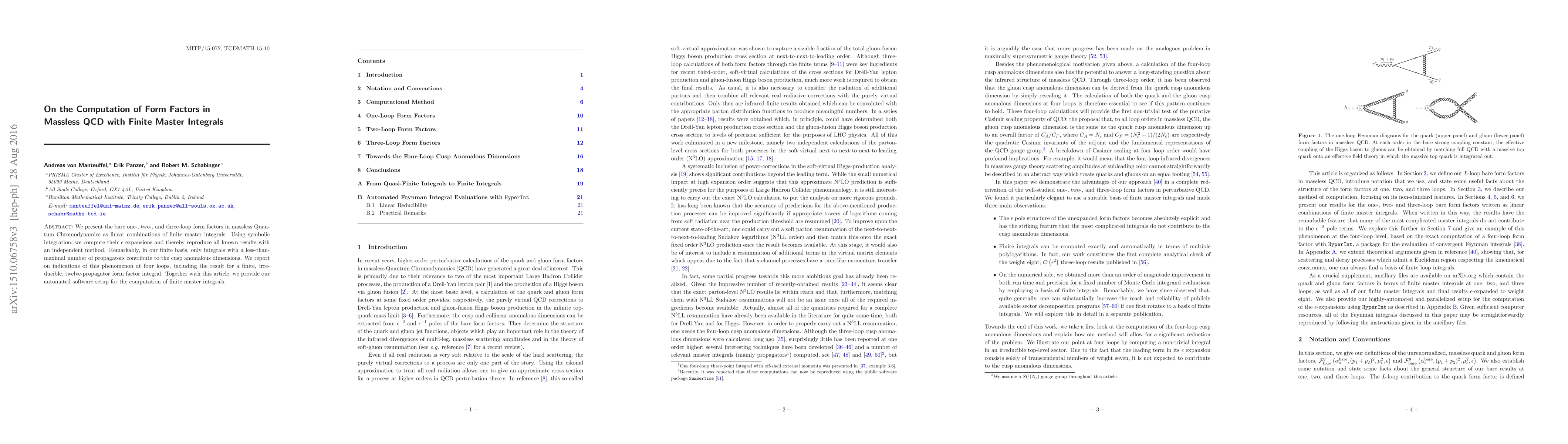We present the bare one-, two-, and three-loop form factors in massless Quantum Chromodynamics as linear combinations of finite master integrals. Using symbolic integration, we compute their $\epsilon$ expansions and thereby reproduce all known results with an independent method. Remarkably, in our finite basis, only integrals with a less-than-maximal number of propagators contribute to the cusp anomalous dimensions. We report on indications of this phenomenon at four loops, including the result for a finite, irreducible, twelve-propagator form factor integral. Together with this article, we provide our automated software setup for the computation of finite master integrals.