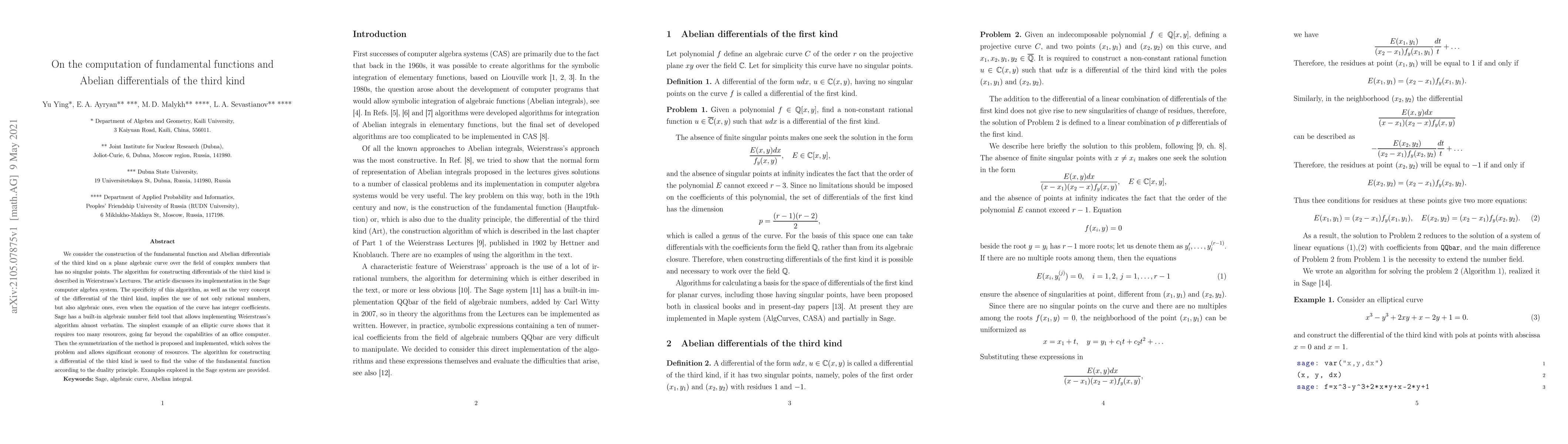 We consider the construction of the fundamental function and Abelian differentials of the third kind on a plane algebraic curve over the field of complex numbers that has no singular points. The algorithm for constructing differentials of the third kind is described in Weierstrass's Lectures. The article discusses its implementation in the Sage computer algebra system. The specificity of this algorithm, as well as the very concept of the differential of the third kind, implies the use of not only rational numbers, but also algebraic ones, even when the equation of the curve has integer coefficients. Sage has a built-in algebraic number field tool that allows implementing Weierstrass's algorithm almost verbatim. The simplest example of an elliptic curve shows that it requires too many resources, going far beyond the capabilities of an office computer. Then the symmetrization of the method is proposed and implemented, which solves the problem and allows significant economy of resources. The algorithm for constructing a differential of the third kind is used to find the value of the fundamental function according to the duality principle. Examples explored in the Sage system are provided.