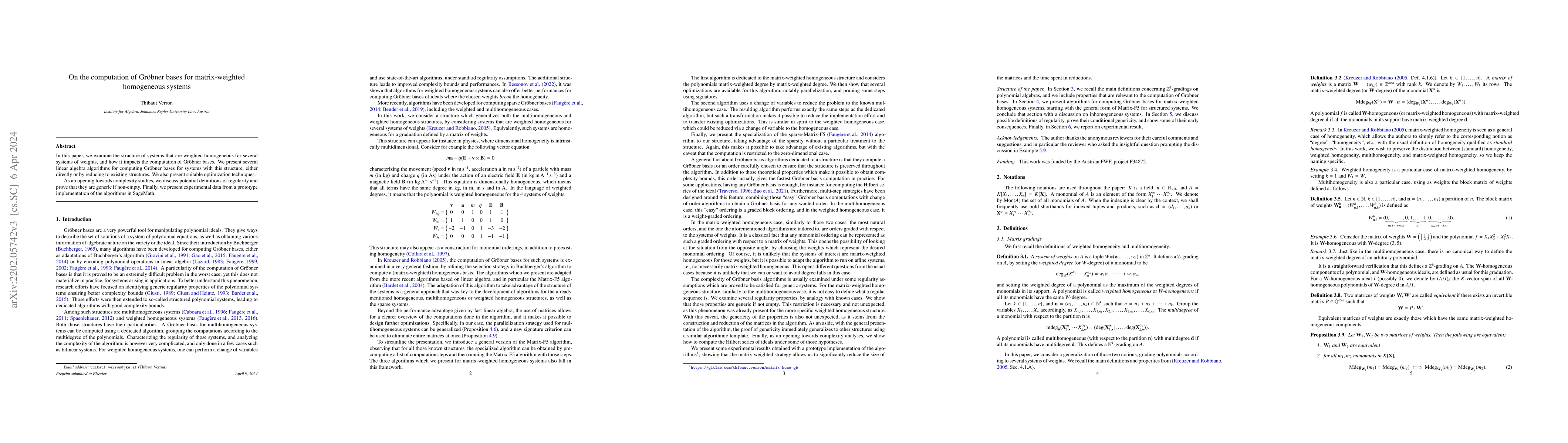 This paper explores the computation of Gröbner bases for matrix-weighted homogeneous systems, presenting linear algebra algorithms for their calculation and optimization techniques. It also introduces preliminary complexity studies and shares experimental results from a SageMath prototype implementation.