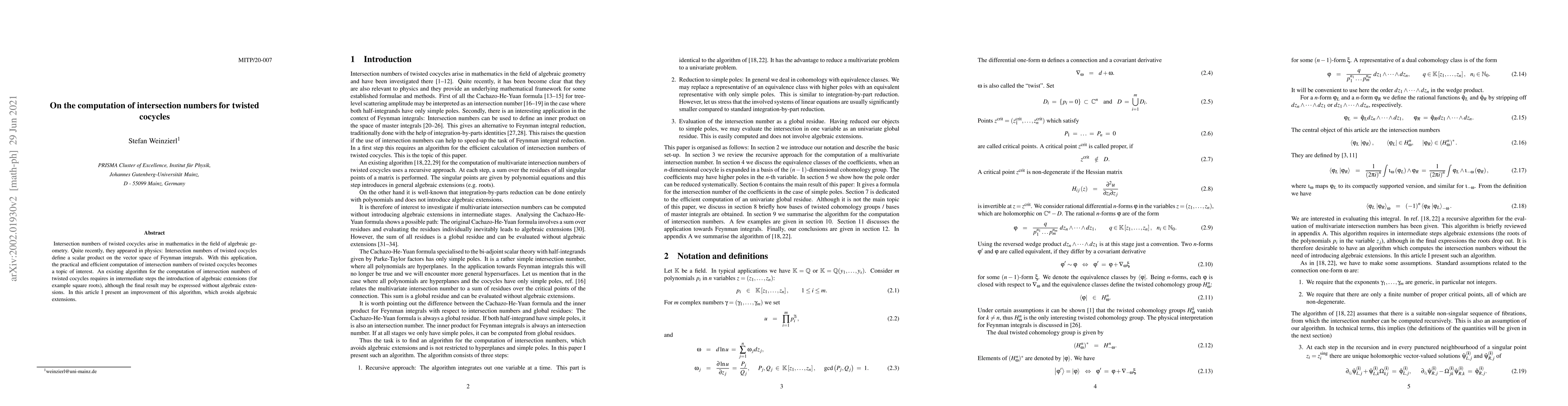 This paper presents an improved algorithm for computing intersection numbers of twisted cocycles, which avoids the use of algebraic extensions in intermediate steps, enhancing efficiency and practicality, especially relevant in the context of Feynman integrals in physics.