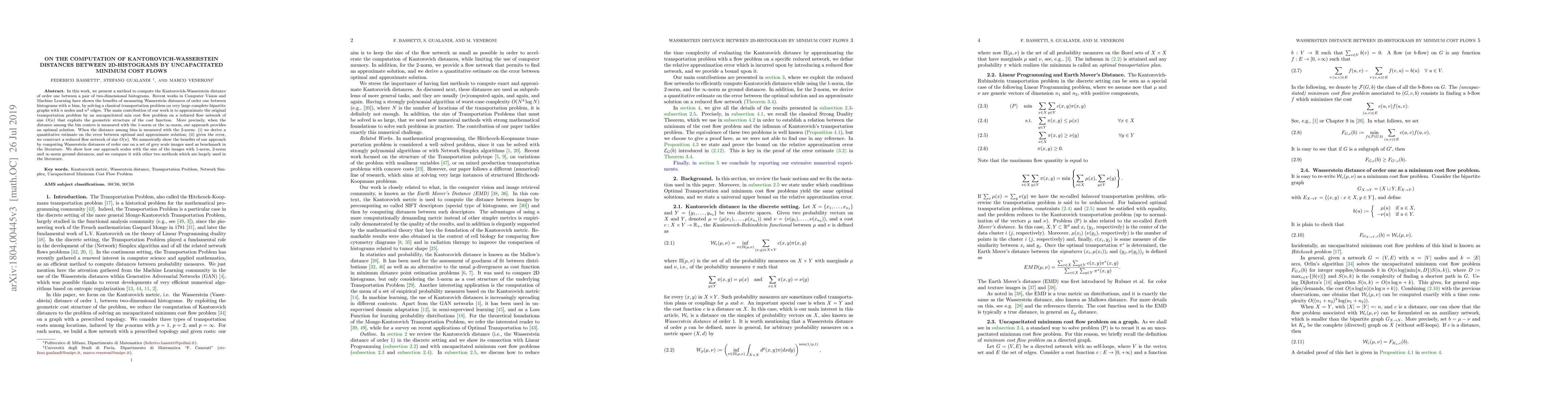 This paper presents a method to compute Wasserstein distances between 2D histograms using uncapacitated minimum cost flows, offering an efficient approach with optimal solutions for certain norms.
