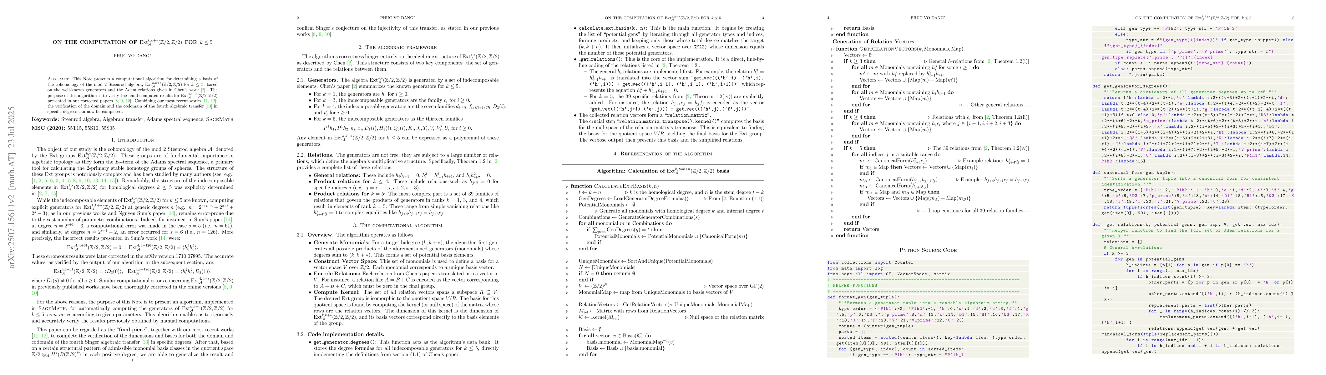 This Note presents a computational algorithm for determining a basis of the cohomology of the mod 2 Steenrod algebra, $\mathrm{Ext}_{\mathcal A}^{k, k+*}(\mathbb{Z}/2, \mathbb{Z}/2)$ for $k \leq 5$, based on the well-known generators and the Adem relations given in Chen's work [2]. The purpose of this algorithm is to verify the hand-computed results for $\mathrm{Ext}_{\mathcal A}^{4, 4+*}(\mathbb{Z}/2, \mathbb{Z}/2)$ presented in our corrected papers [8, 9, 10]. Combining our most recent works [11, 12], the verification of the domain and the codomain of the fourth algebraic transfer in specific degrees can now be completed.