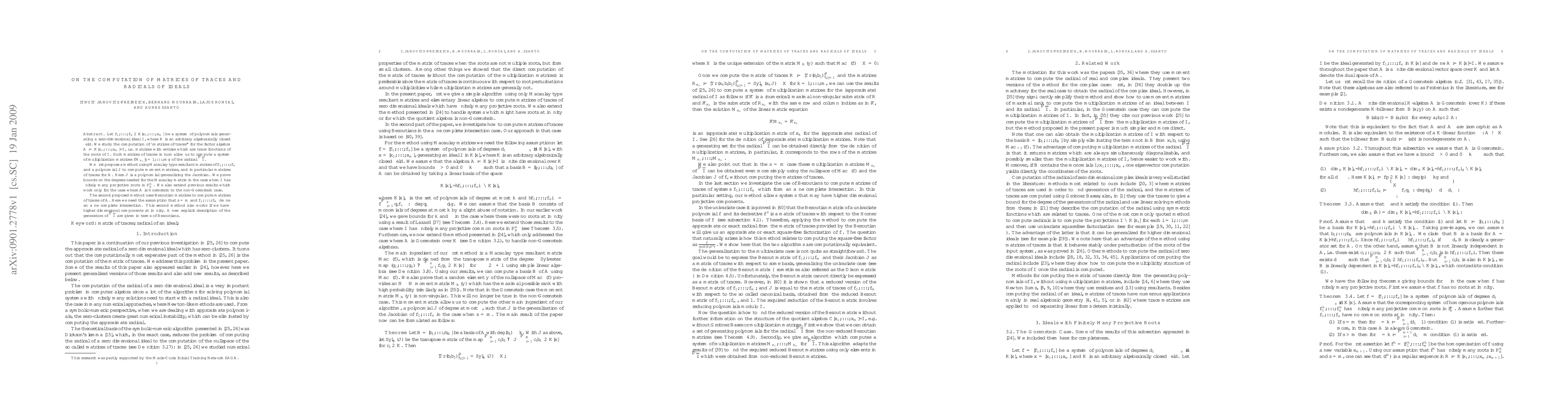 This paper presents methods for computing matrices of traces and radicals of zero-dimensional ideals generated by polynomials in an algebraically closed field. It introduces two approaches: one using Macaulay resultant matrices to compute moment matrices, and another employing Bezoutian matrices. The methods provide bounds on required degrees and extend previous results to non-Gorenstein cases, offering new insights into generators of the radical ideal.