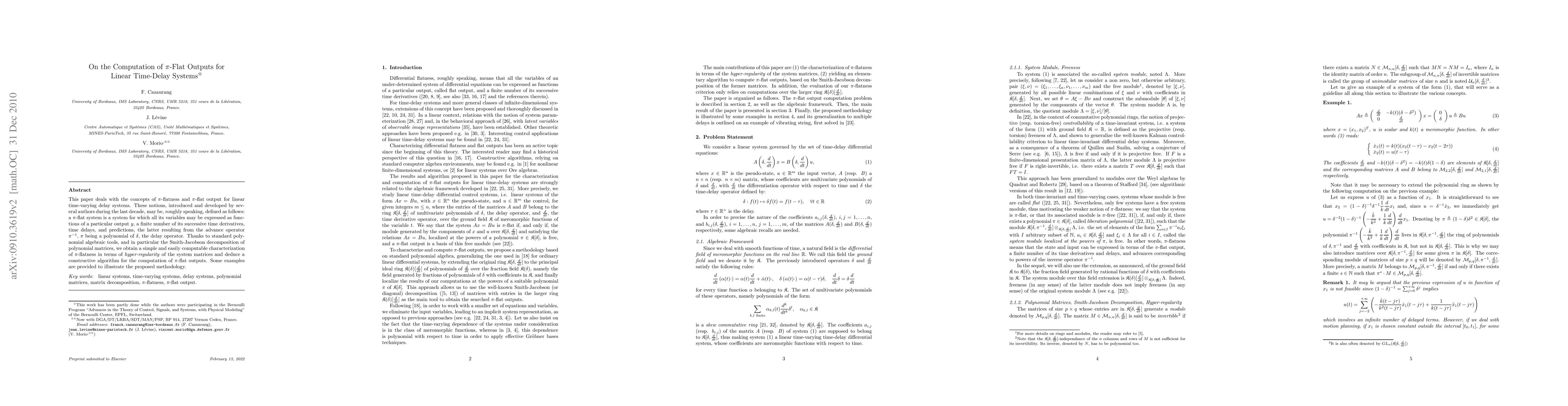 This paper proposes a constructive algorithm for computing $\pi$-flat outputs in linear time-delay systems, leveraging polynomial algebra and Smith-Jacobson decomposition. The methodology is illustrated through examples.