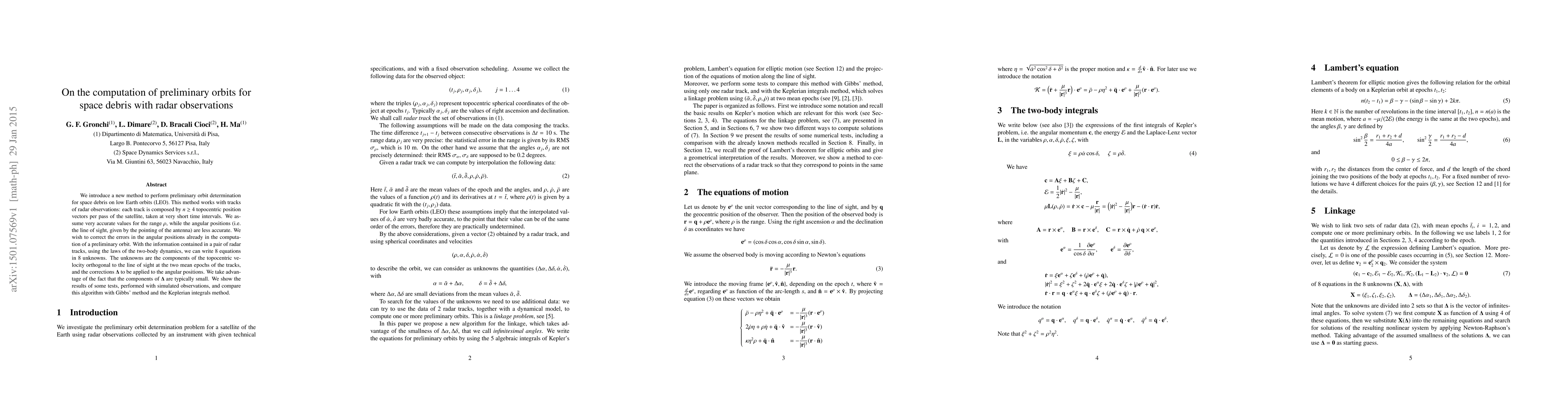 We introduce a new method to perform preliminary orbit determination for space debris on low Earth orbits (LEO). This method works with tracks of radar observations: each track is composed by $n\ge 4$ topocentric position vectors per pass of the satellite, taken at very short time intervals. We assume very accurate values for the range $\rho$, while the angular positions (i.e. the line of sight, given by the pointing of the antenna) are less accurate. We wish to correct the errors in the angular positions already in the computation of a preliminary orbit. With the information contained in a pair of radar tracks, using the laws of the two-body dynamics, we can write 8 equations in 8 unknowns. The unknowns are the components of the topocentric velocity orthogonal to the line of sight at the two mean epochs of the tracks, and the corrections $\Delta$ to be applied to the angular positions. We take advantage of the fact that the components of $\Delta$ are typically small. We show the results of some tests, performed with simulated observations, and compare this algorithm with Gibbs' method and the Keplerian integrals method.