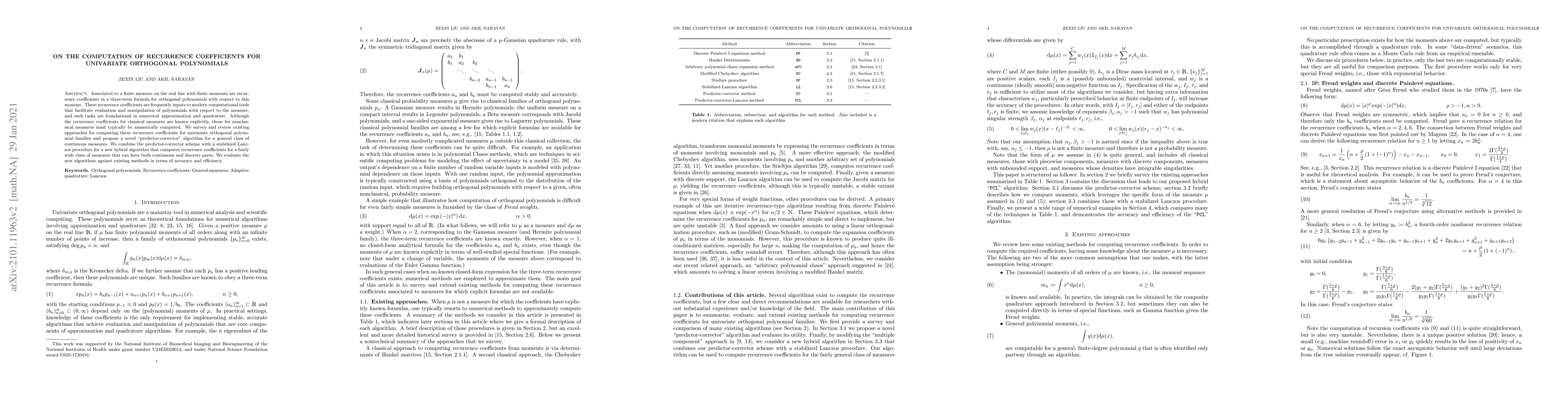 This paper surveys existing methods for computing recurrence coefficients for univariate orthogonal polynomials and proposes a novel predictor-corrector algorithm combined with a stabilized Lanczos procedure for a hybrid approach. The new method is evaluated for accuracy and efficiency against existing techniques.