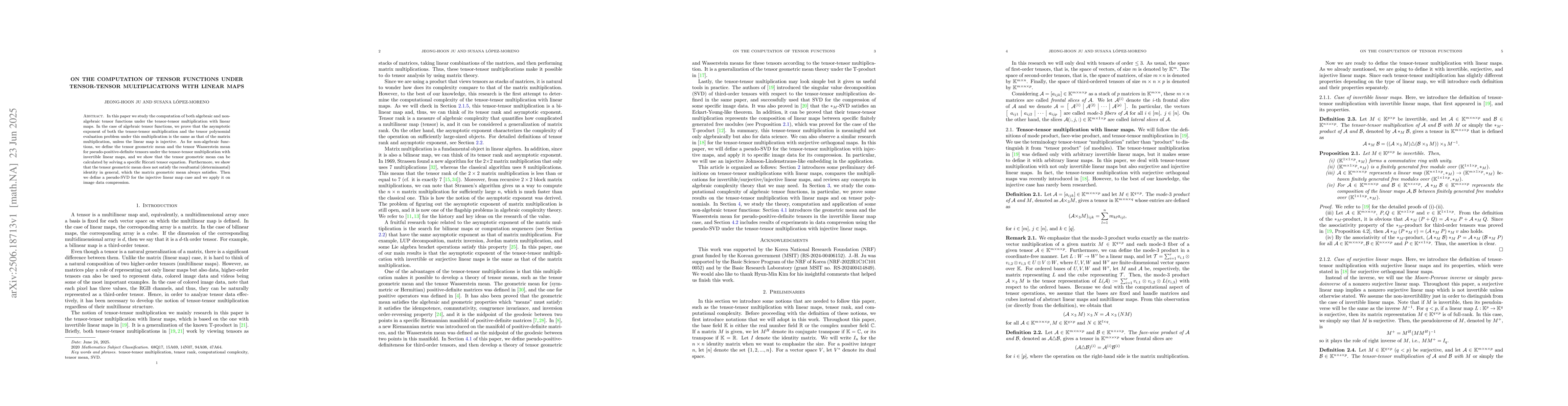 In this paper we study the computation of both algebraic and non-algebraic tensor functions under the tensor-tensor multiplication with linear maps. In the case of algebraic tensor functions, we prove that the asymptotic exponent of both the tensor-tensor multiplication and the tensor polynomial evaluation problem under this multiplication is the same as that of the matrix multiplication, unless the linear map is injective. As for non-algebraic functions, we define the tensor geometric mean and the tensor Wasserstein mean for pseudo-positive-definite tensors under the tensor-tensor multiplication with invertible linear maps, and we show that the tensor geometric mean can be calculated by solving a specific Riccati tensor equation. Furthermore, we show that the tensor geometric mean does not satisfy the resultantal (determinantal) identity in general, which the matrix geometric mean always satisfies. Then we define a pseudo-SVD for the injective linear map case and we apply it on image data compression.